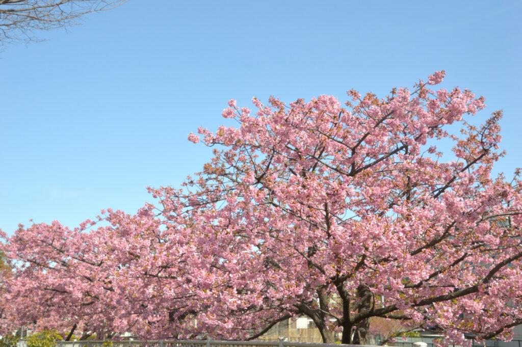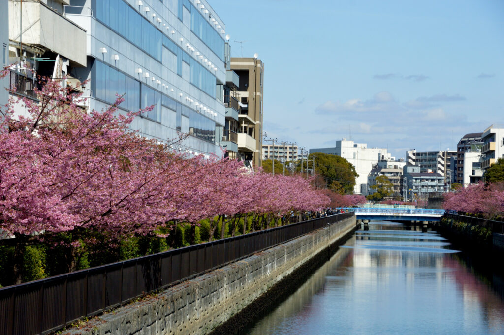 方向を間違えやっと見つけた 木場公園横を流れる大横川岸両岸に咲く河津さくら 2月20日にも来たが曇り やはり青空が映える