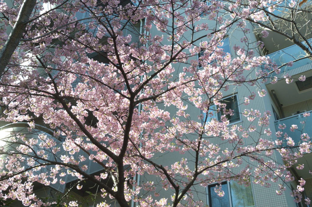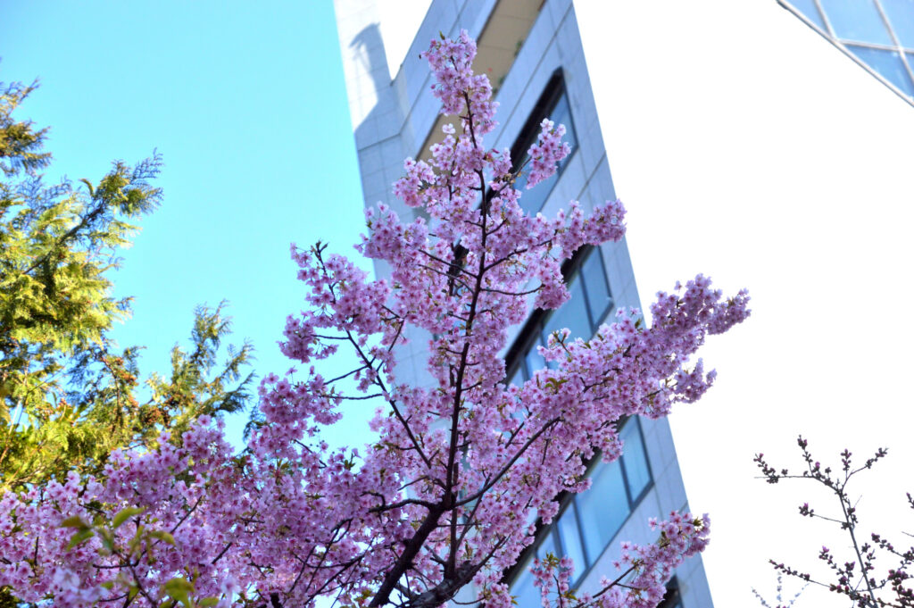 天現寺交差点角にある天現寺 ビルに隠れて1本の河津さくら 満開