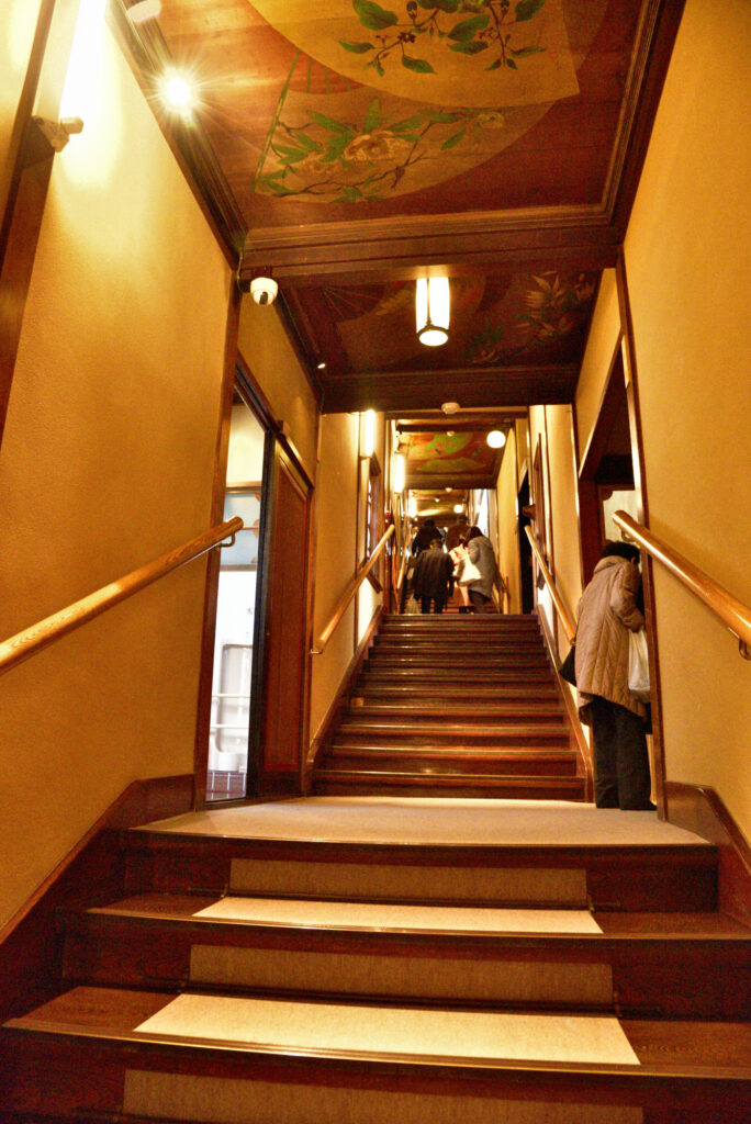 百段階段」とは通称で、ホテル雅叙園東京の前身である目黒雅叙園3号館にあたり、1935(昭和10)年に建てられた当館で現存する唯一の木造建築です。食事を愉しみ、晴れやかな宴が行われた7部屋を、99段の長い階段廊下が繋いでいます。階段は厚さ約5cmのケヤキ板を使用。階段で結ばれた各部屋はそれぞれ趣向が異なり、各部屋の天井や欄間には、当時屈指の著名な画家達が創り上げた美の世界が描かれています