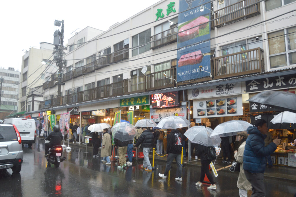 3月29日 築地場外 雨でも観光客は傘をさして
