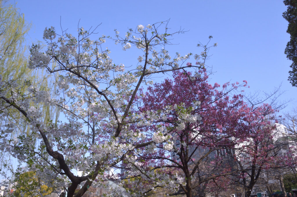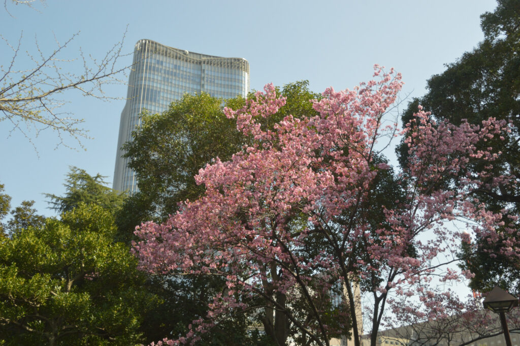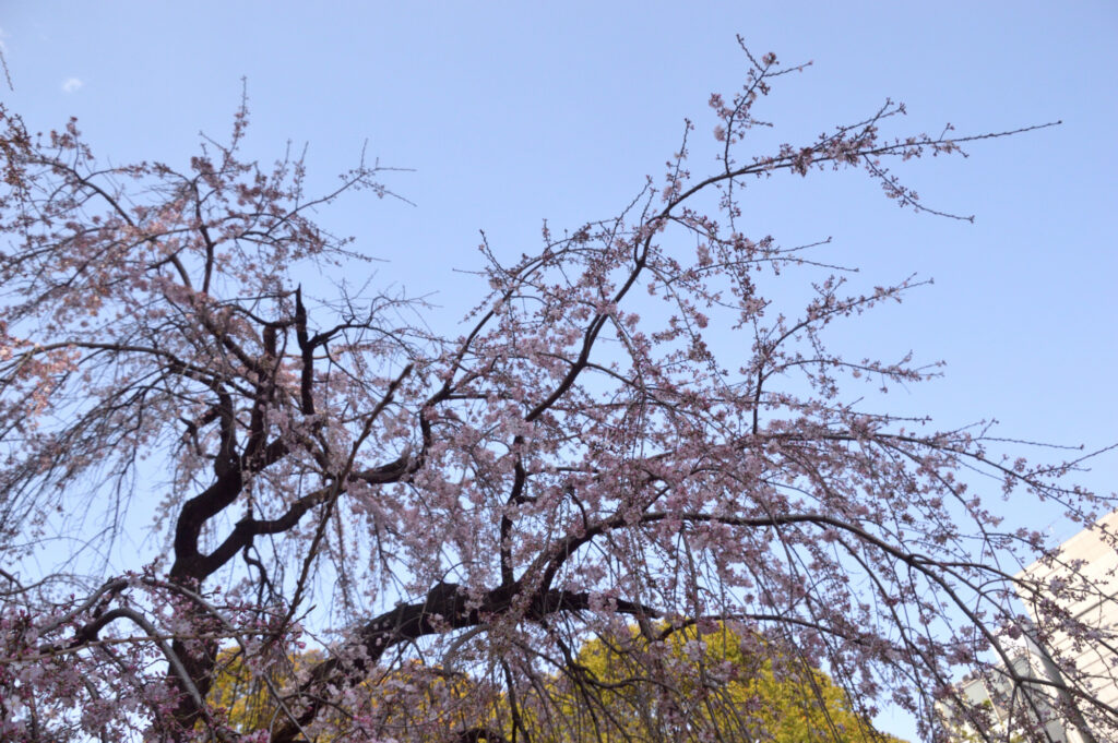 日比谷口に向かうと1本の桜 陽光