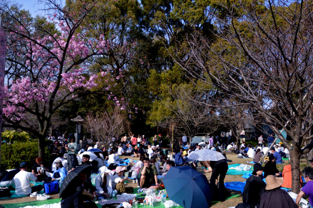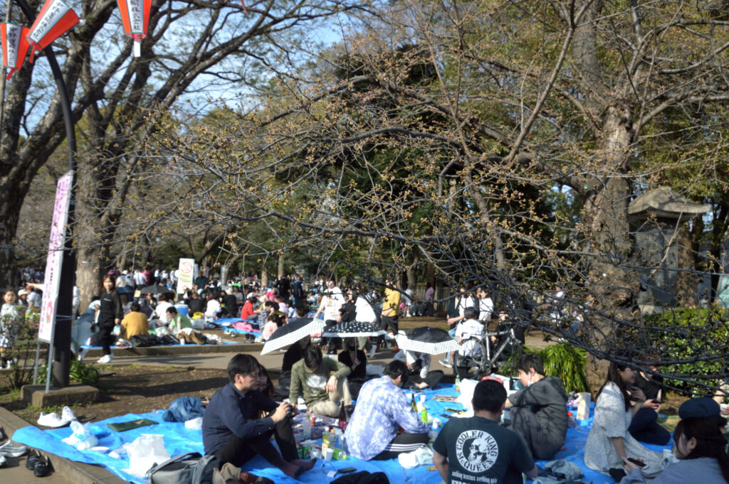 上野 清水観音堂横のひろば 桜は陽光のみ咲いてるが花見客はこの通り