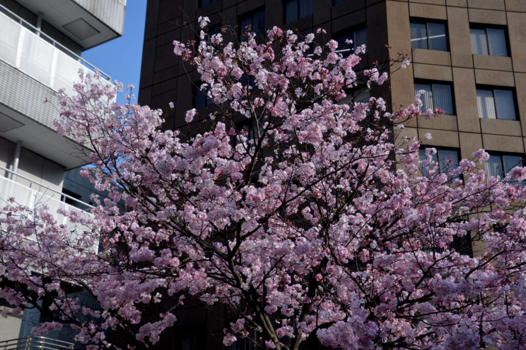 上野 不忍池から上野恩賜公園に向かい御徒町で用事を済ませ昭和通りを日本橋方面に 神田川に架かる和泉橋 この近辺 神田岩本町近辺は既製服問屋発祥の地 橋袂には1本の桜 陽光が咲いてる