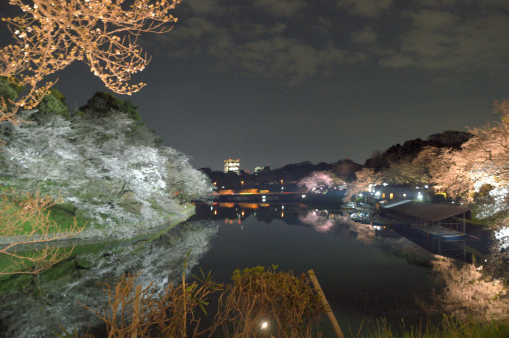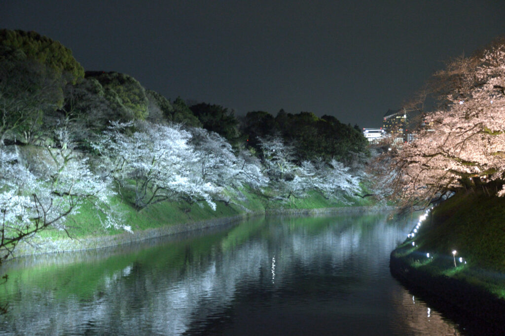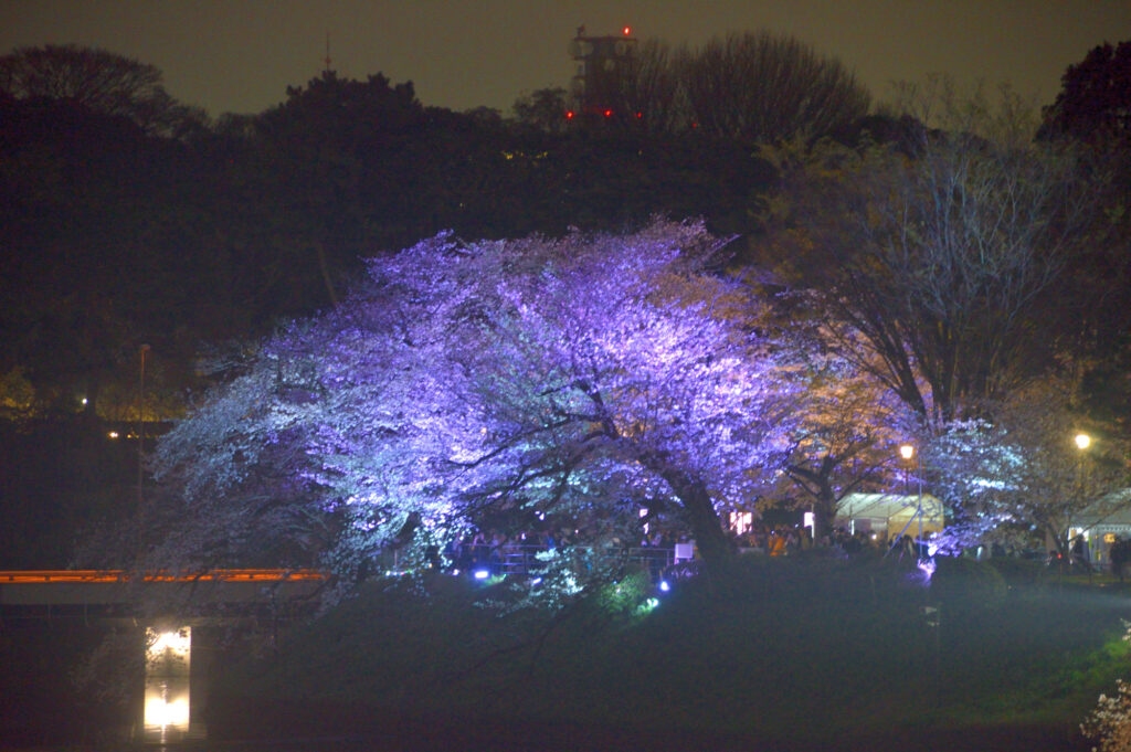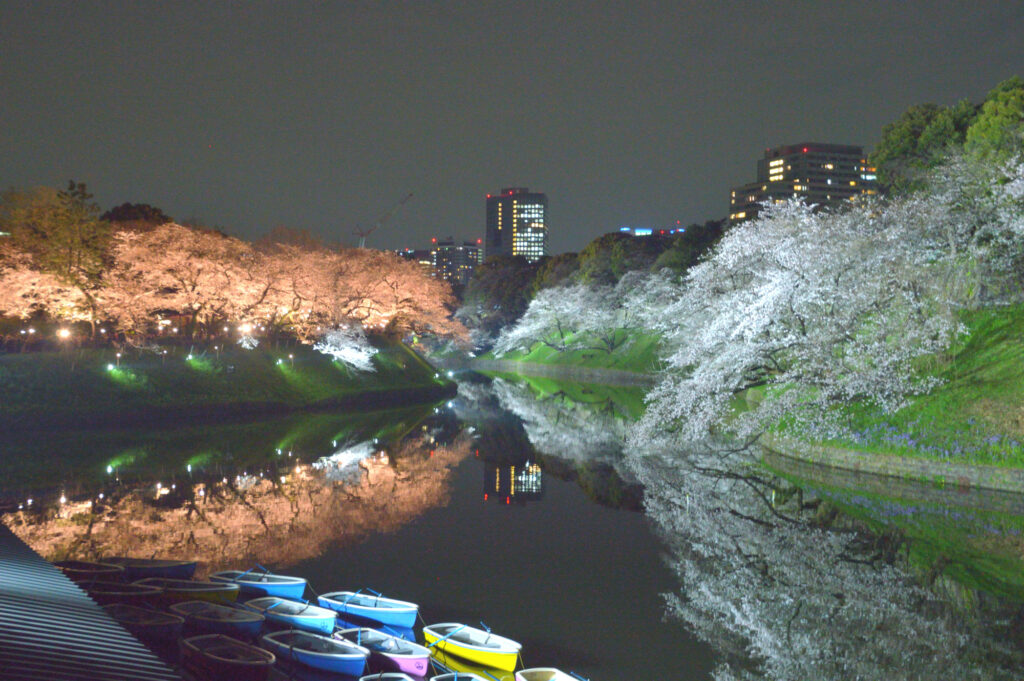 この先は千鳥ヶ淵公園 夜桜で花見客が宴会をしてる場所 その手前の代官町通り下にある桜のライトアップがこくこくと色が変化する