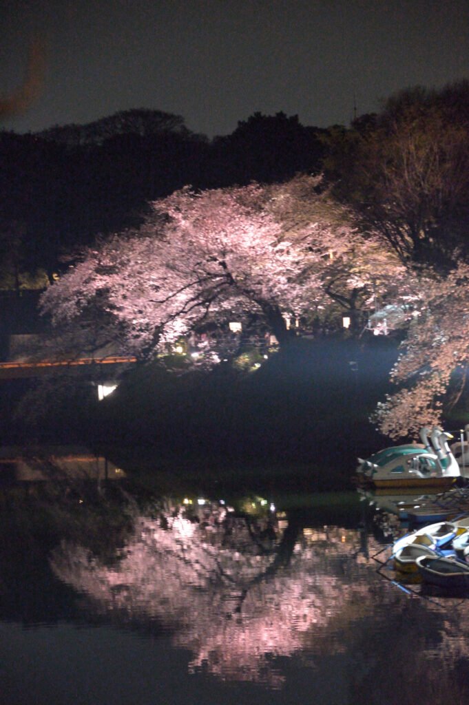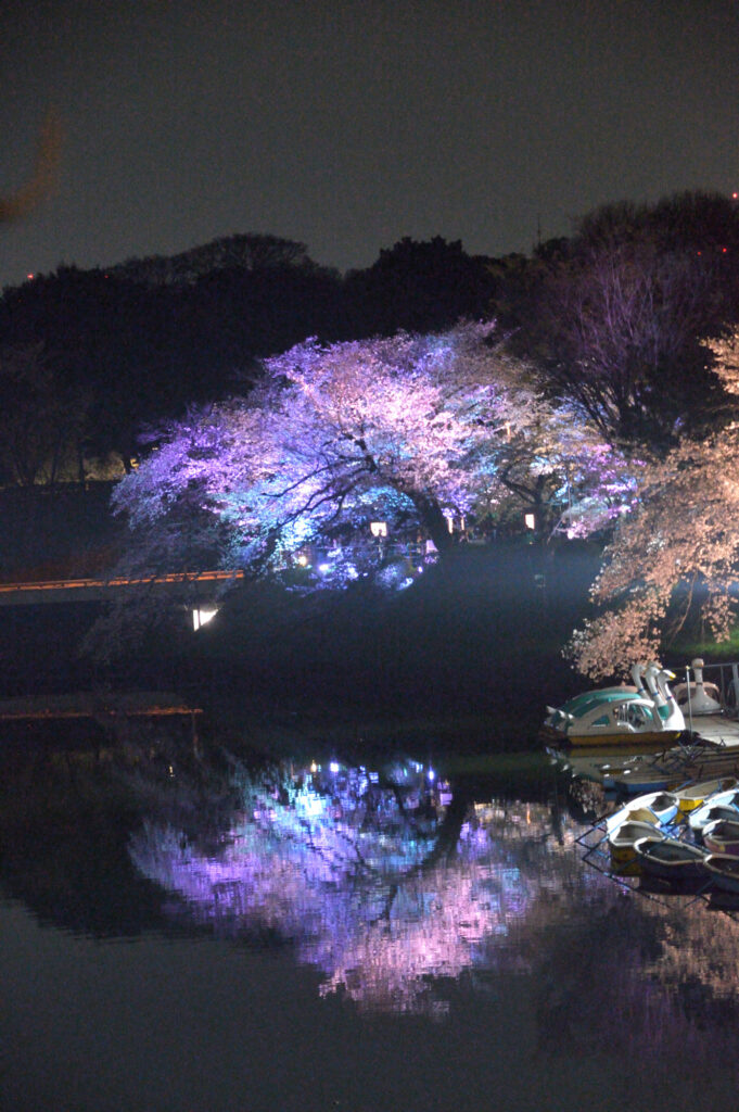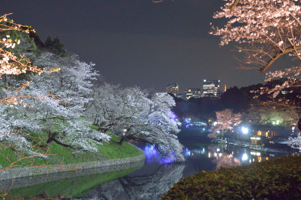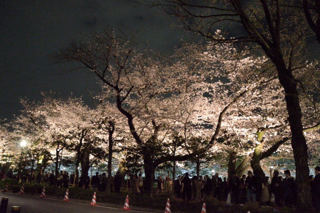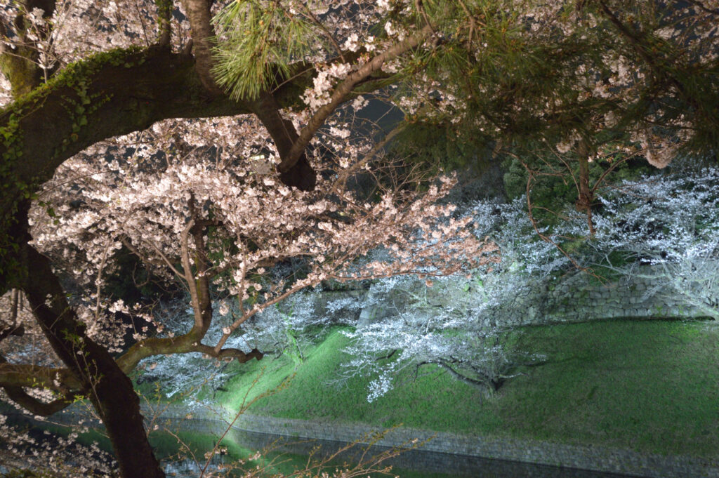 この先は千鳥ヶ淵公園 夜桜で花見客が宴会をしてる場所 その手前の代官町通り下にある桜のライトアップがこくこくと色が変化する