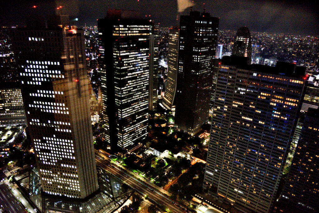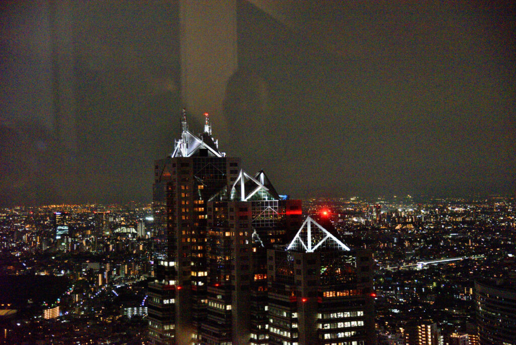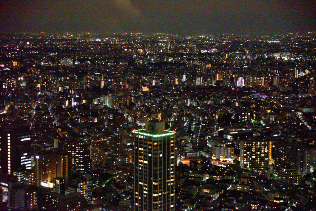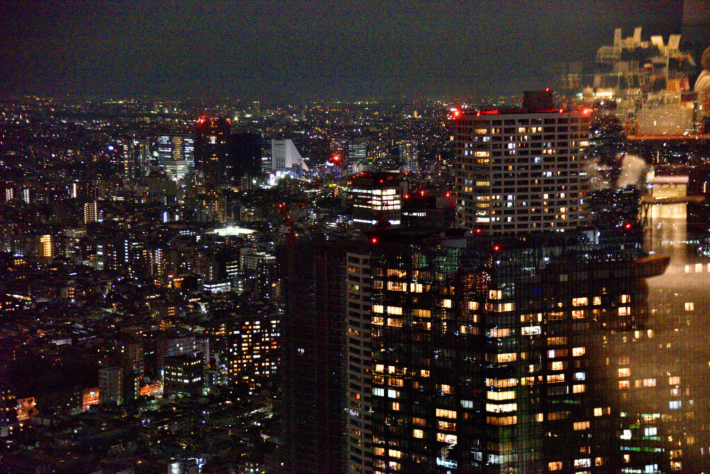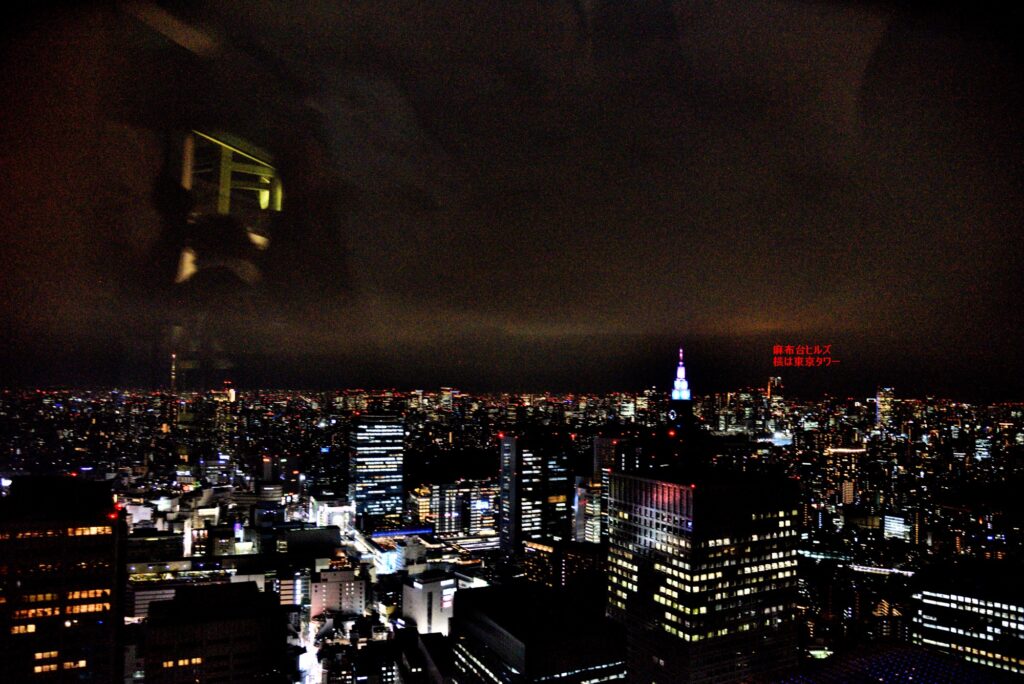 帰路 都庁展望台 南と北があり 北は休室中 今回は南展望台 22時迄 入場は21:30? 列の最後尾 20-30分待ちでエレベーターで45階に 55秒 202m 真ん中にお店もあり休憩できる