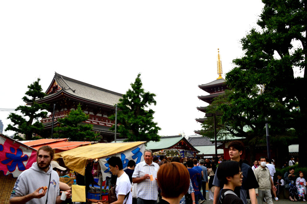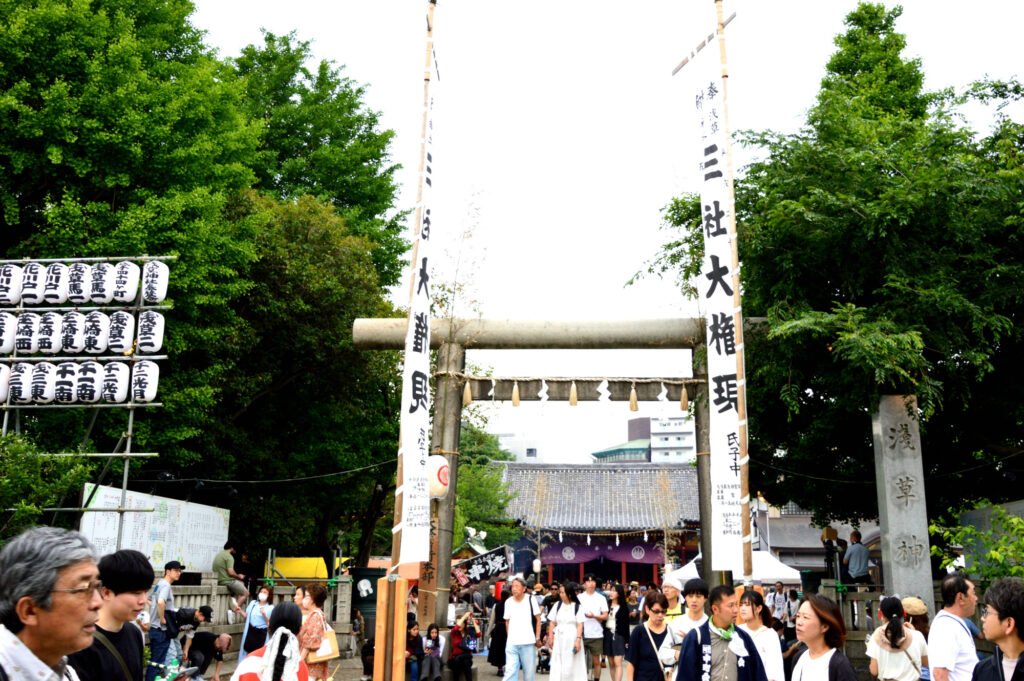 浅草寺 本堂前 欄間には神輿を見る人であふれてる