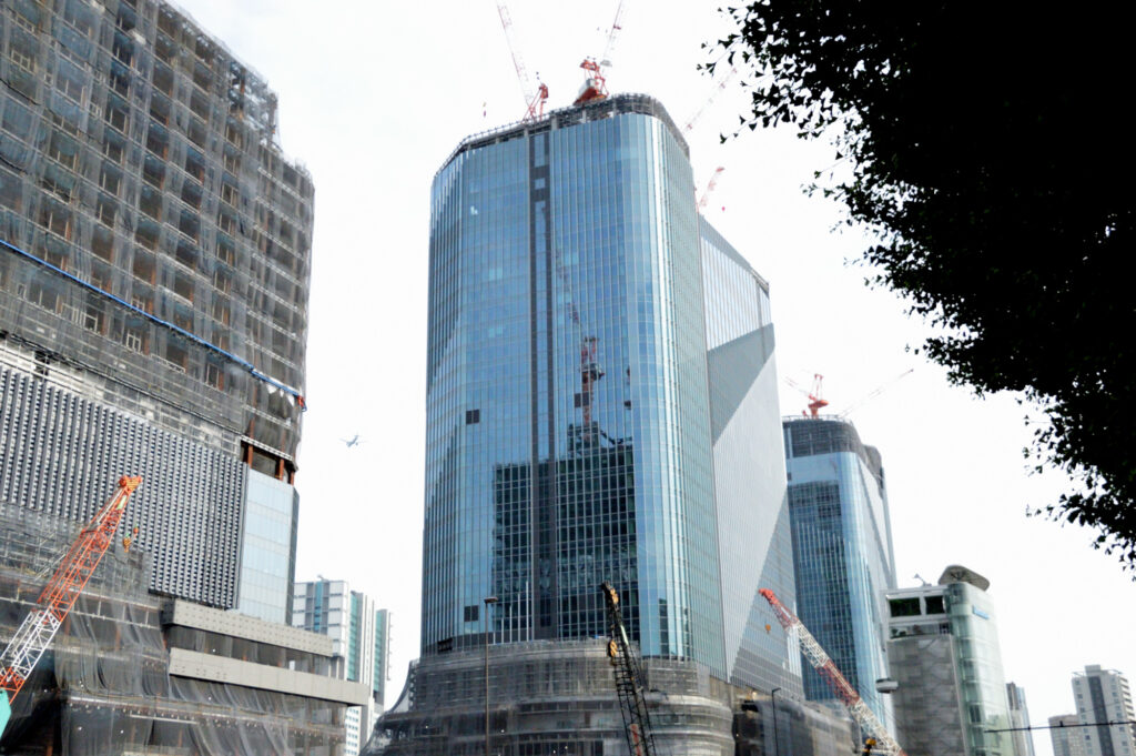 多摩川を下り二子玉川橋を過ぎさらに下流に 第一京浜がかかる六郷橋から左折 蒲田 から品川方面に 新しく出来たJR 高輪ゲートウエイ駅 1872(明治5)年の国内初の鉄道開業時、東京湾の浅瀬に線路を敷設するため造られた「高輪築堤」の遺構が、東京都港区の再開発現場から出土した。かつて「列車が海の上を走る」と東京名所に数えられたが、一帯の埋め立てで姿を消していた。遺構は断続的に約1.3キロメートルにわたり確認。保存状態も良好で、新聞種でよく報道された所 第一京浜沿いは再開発 このような高層ビルが並び始めた 上空を羽田到着便が15時過ぎから通過し始める