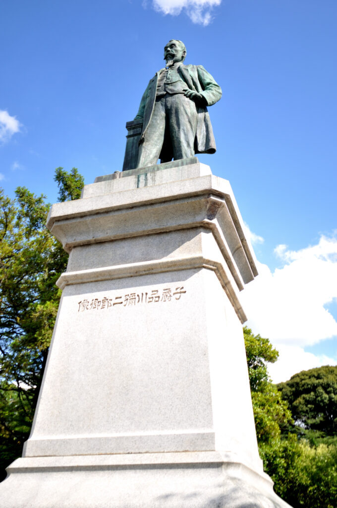 明治政府設立後、明治3年(1870年)、ロンドン、ドイツ等の欧州に留まり、次第に政治や経済に注目するようになった。像は、明治40年 (1907年)に設置された
