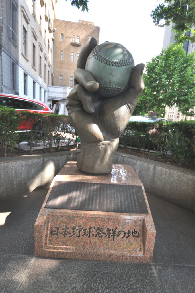 神保町・学士会館のそばに立つ大きな野球ボールを握った手の像。1873年にこの地に東京大学の前身開成学校で、アメリカ人教師ホーレス・ウイルソン氏が生徒たちに野球を教えことから、野球運動場の整備とともに全国へと広まっていった。2003年に日本野球伝来の功労者として野球殿堂入りしたウイルソン氏の功績と「野球発祥の地」として建てられた碑