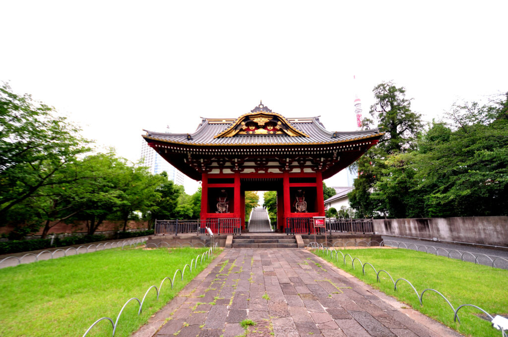 芝公園に隣接する 芝増上寺 旧台徳院霊廟惣門 「旧台徳院霊廟惣門」は、「芝公園」の「日比谷通り」沿いにある、「第二代将軍徳川秀忠の霊を祀る場所」の正面にあった門です。