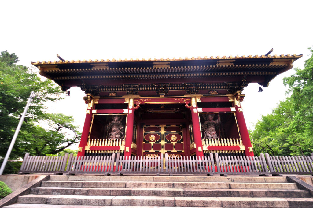 有章院霊廟二天門 重文 有章院は第7代将軍徳川家継(1709~1716)の院号、夭逝した将軍で、その霊廟は第8代将軍徳川吉宗によって建立された豪華なものであったといわれるが、昭和20年(1945)の空襲で、当該二天門のみが残り、他の全てが焼失した