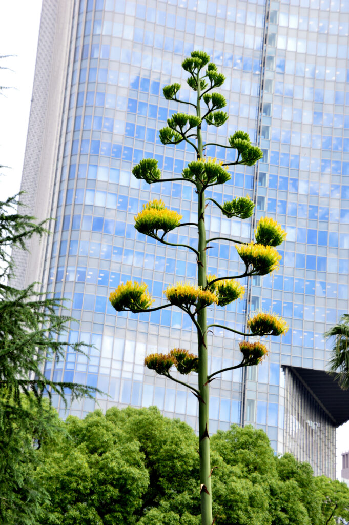 数十年に一度しか開花しないと言われ、「1世紀に一度開花する植物(センチュリープラント)」の別名を持つリュウゼツラン。そんな珍しい巨大植物を銀座や有楽町にほど近い、都心の日比谷公園でご覧いただけます。今回開花したアオノリュウゼツランは日比谷公園・第一花壇の「ペリカン噴水」の脇にあります。7月10日開花宣言