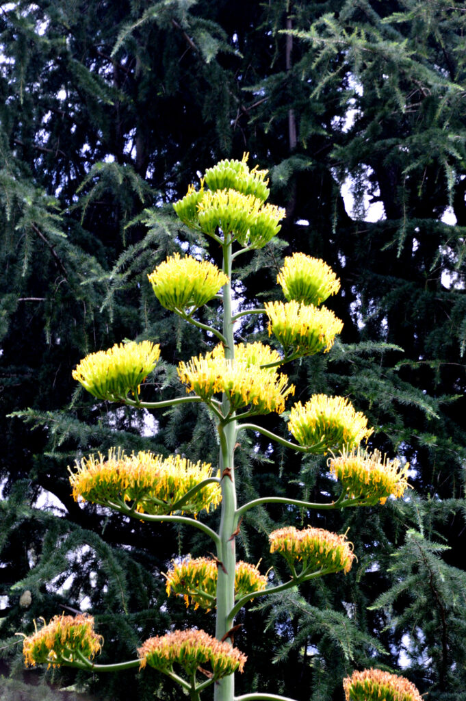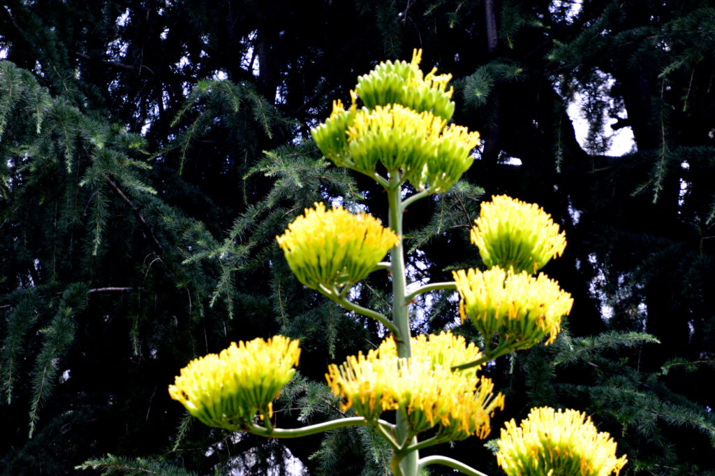 64年ぶり咲いた 全長10m近いのかな 手前のアオノリュウセイランは6年前に咲いたそうです