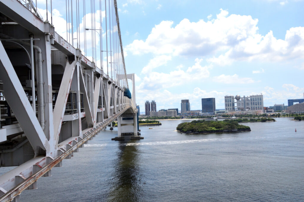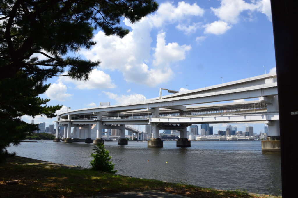 レインボーブリッジを渡るためアダプターを付けて7Fに 押して渡始める第六台場 台場公園に囲われたお台場ビーチ