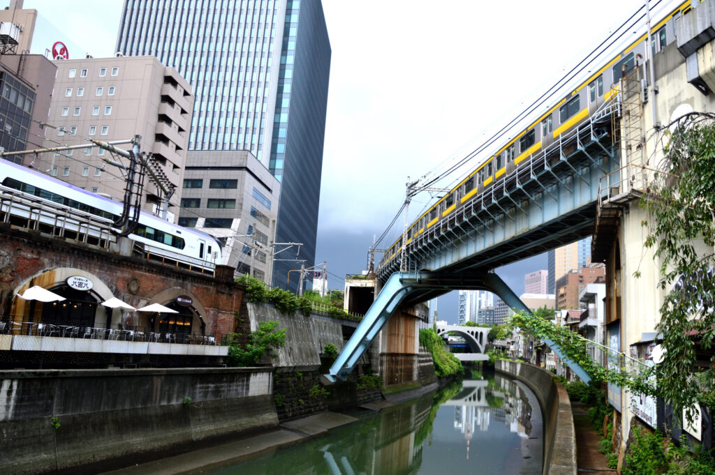 上野に向かう途中神田川と昌平橋 正面聖橋 下がメトロ線路 JR電車通過中