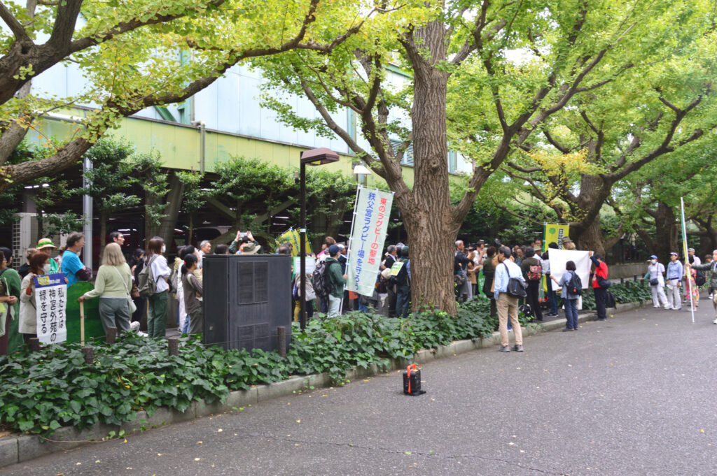 文化財保全の提言をし、見直し議論をリードしてきた日本イコモス国内委員会の石川幹子理事は「樹木は他の木や下草などと互いに関係しながら成長する。樹林地としての生態系をどう保存するかが重要。今回の見直しはこの視点に欠け、樹木の本数に終始している 報道陣が場内に案内されてるが石川理事は入場できず 排除されてる