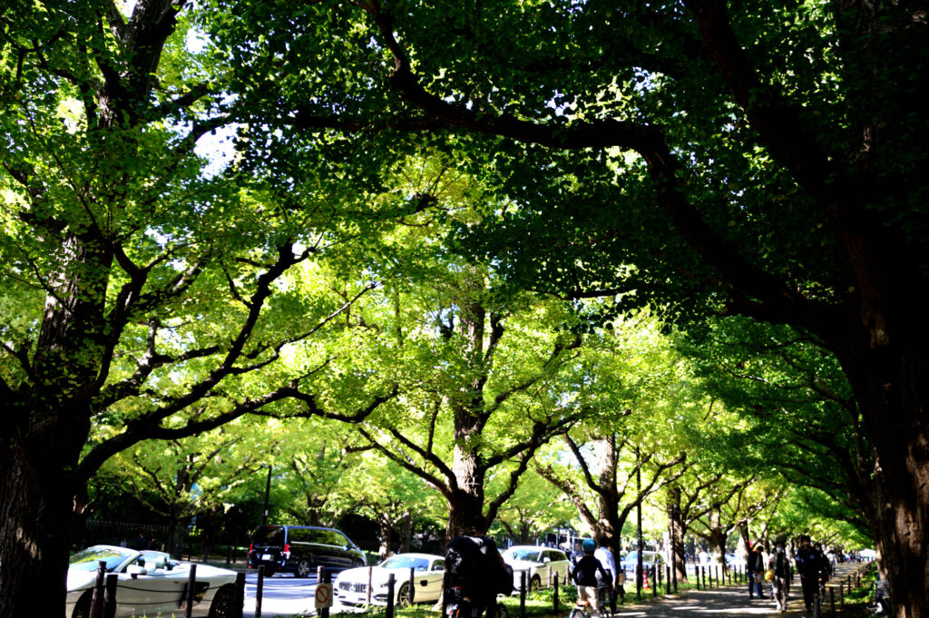 神宮外苑 銀杏並木はこの通り 黄色くなるのは11月後半 OR 12月初め?