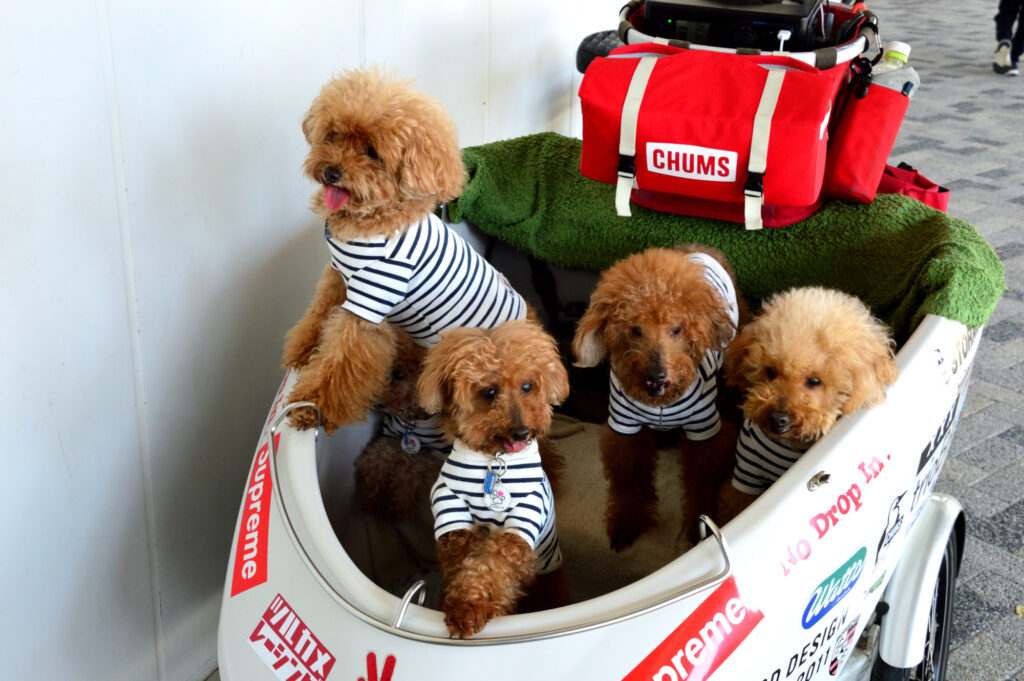 自転車 5匹のワンちゃん 五つ子?