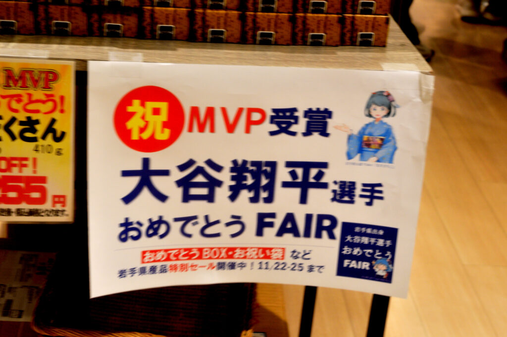 東銀座 歌舞伎座前にある岩手県アンテナショッピ 銀河プラザ MVP受賞 大谷翔平選手おめでとう 売り出し中