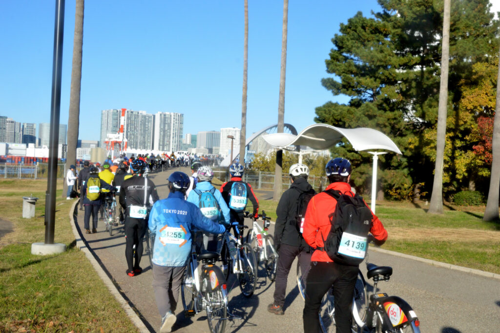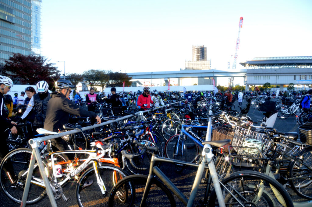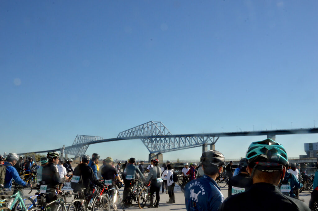 案内には07:45 受付開始 8:15 受付完了 スタート 08:45 久しぶりに 早朝出発 会場に到着 自転車を受け取り スタート列に並ぶ スタートするとレインボーブリッジ ゲートブリッジ等々 写真を撮るために止まること禁止 コースには事故防止で役員が多数配置されてる