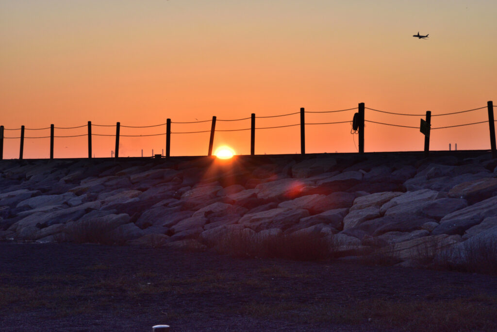 やっと取れた場所が前に羽田空港と運河を遮る防波堤 定刻防波堤上が赤く染まり始め 防波堤上から出始めた
