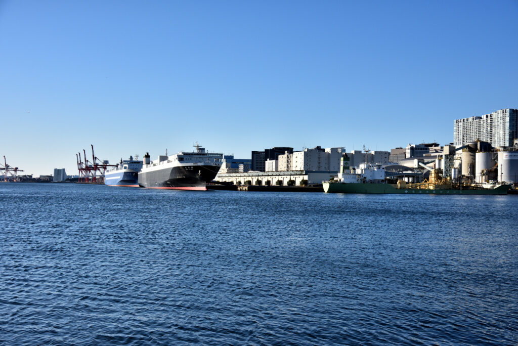 芝浦南ふ頭公園 繋留中のコンテナ船 晴海ふ頭に海上保安庁 巡視船 午前8時