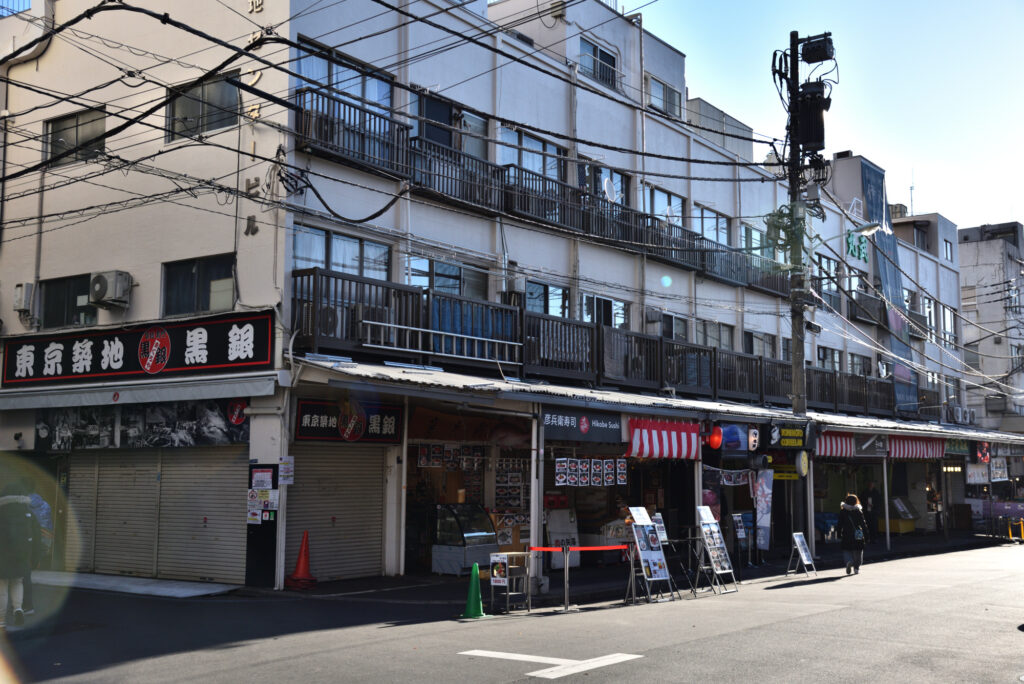 南ふ頭から日の出桟橋 竹芝桟橋 浜離宮を抜け築地場外に 1月5日から開かれると聞いていたが観光客相手に回転ずし はじめ数多くの飲食店が開いていた 午前8時30分頃 これから観光客が来るのだろう