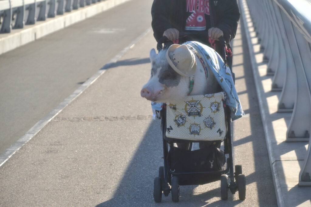 帰路羽田空港に架かる多摩川スカイブリッジ上で豚を散歩してる人発見 空港に沿って産業道路から品川を抜け帰宅