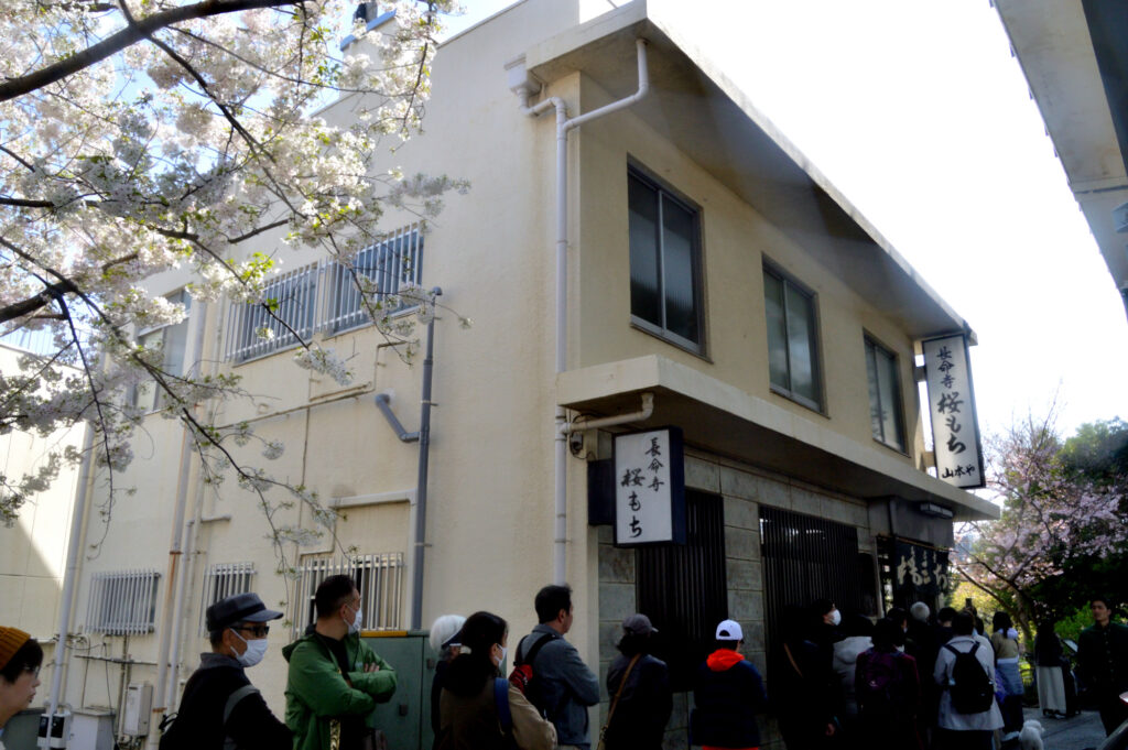 桜橋を過ぎ 有名な長命寺桜餅 言問団子と有名なお菓子屋さんがあり 桜餅を並んで購入