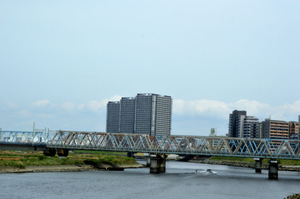 多摩川 神奈川県側を下り第一京浜 六郷橋袂 明治天皇六郷渡碑 梨 長十郎ふるさと碑から橋を渡り都内 蒲田から大森方面に向かう