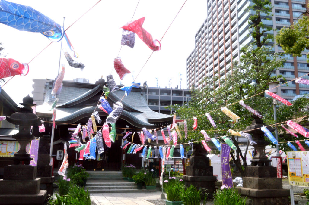 国道15号沿い 大森界隈で磐井神社で鯉のぼり発見 品川 新橋から左折 帰宅する