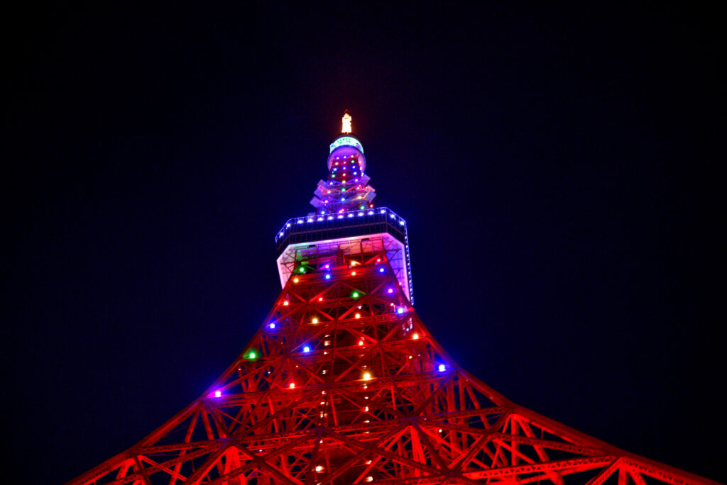 タワー塔体に17段の階層に設置された268台のLEDライト1つ1つの光が、多様に変化して、無限の光色パターンを描き出します。ゴールデンウイークは、この「インフィニティ・ダイヤモンドヴェール」の中でも ひと際カラフルな、7色のカラーを散りばめたライトアップを点灯します