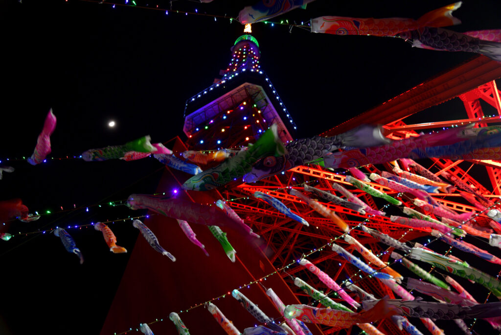 こどもの日 東京タワー下の鯉のぼりと大勢の人人