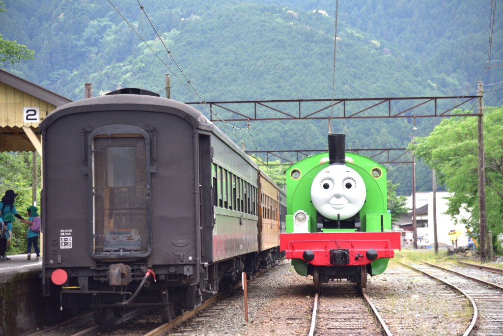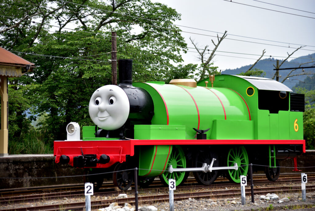 家山駅 到着 ここからバスだが駅構内に 機関車トーマスと昔の車両