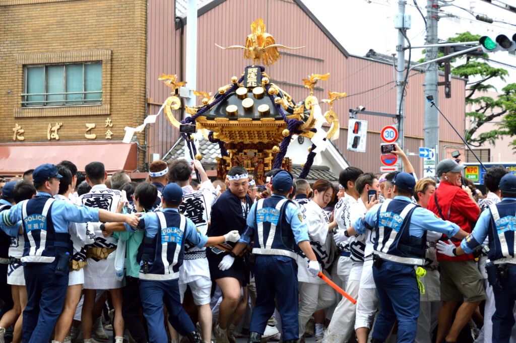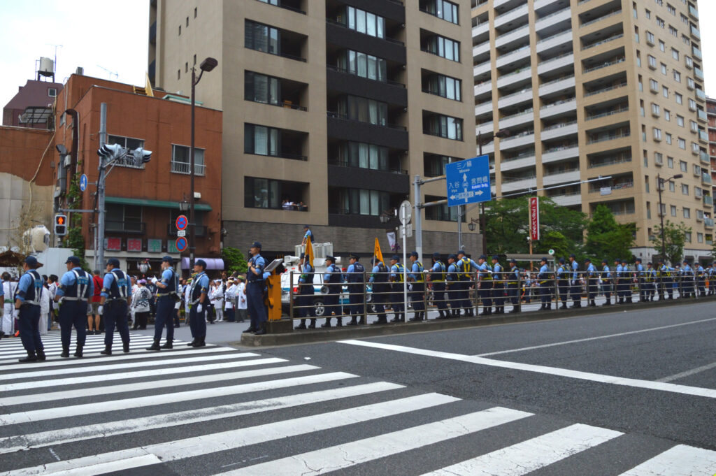 国際通りに出てくる西浅三北 町神輿 警察官が大勢い待機 多分例年通りに出るときにおおいにもむので待機 規制