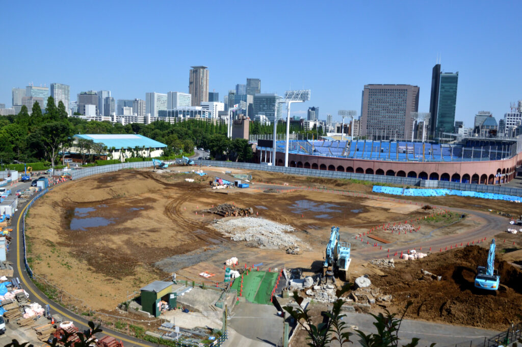 国立競技場の5Fから神宮外苑再開発地区を見る 神宮第2球場解体 周りの樹木も伐採 移設 子の樹木も同様 神宮球場 奥の伊藤忠ビルも時間の問題 解体される