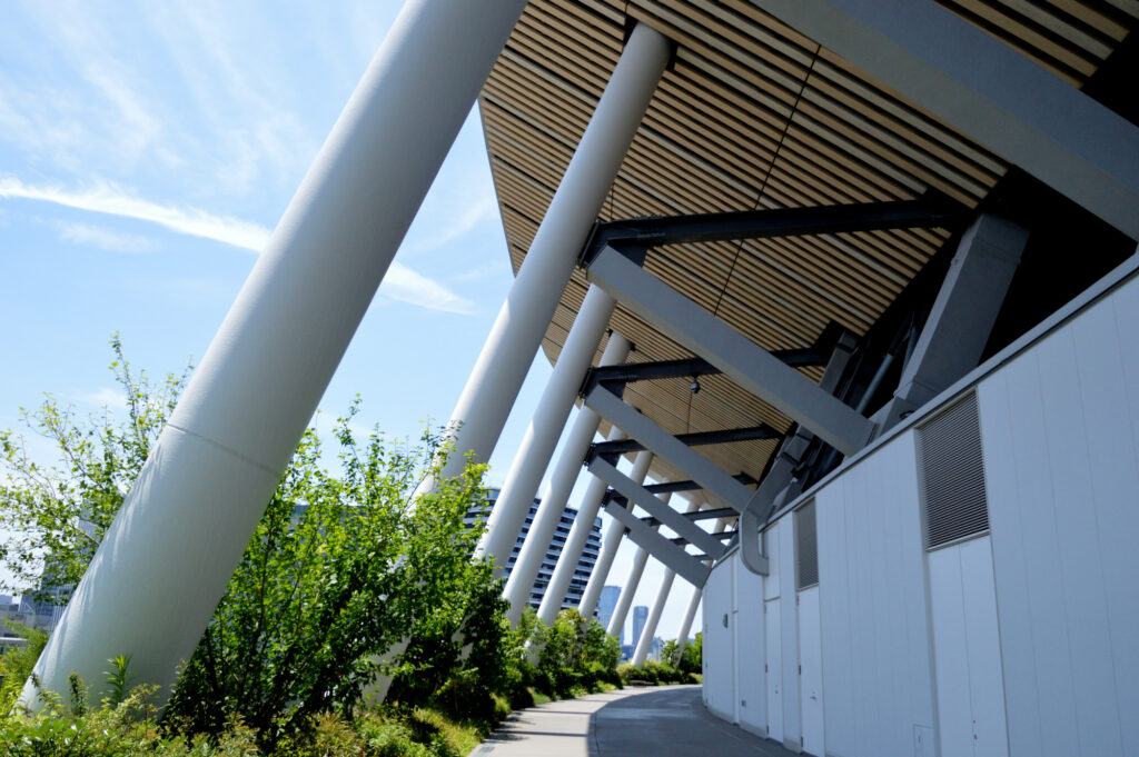 今日も快晴 熱中症に注意 テレビで放映中 あまり気にせず 自転車で家出発 銀杏並木を抜け国立競技場に向かう エレベーターで5F 集集会コースに