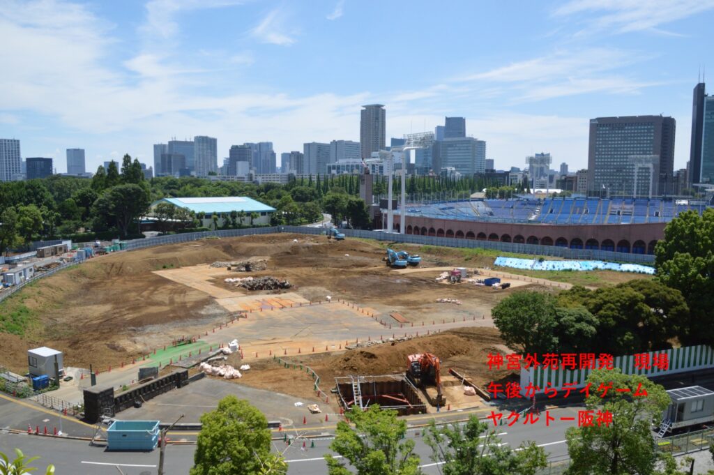 明治神宮再開発 神宮第二球場跡 右手高層ビル 伊藤忠ビル 解体 立て直し 神宮球場 今日はデーゲーム ヤクルト 阪神