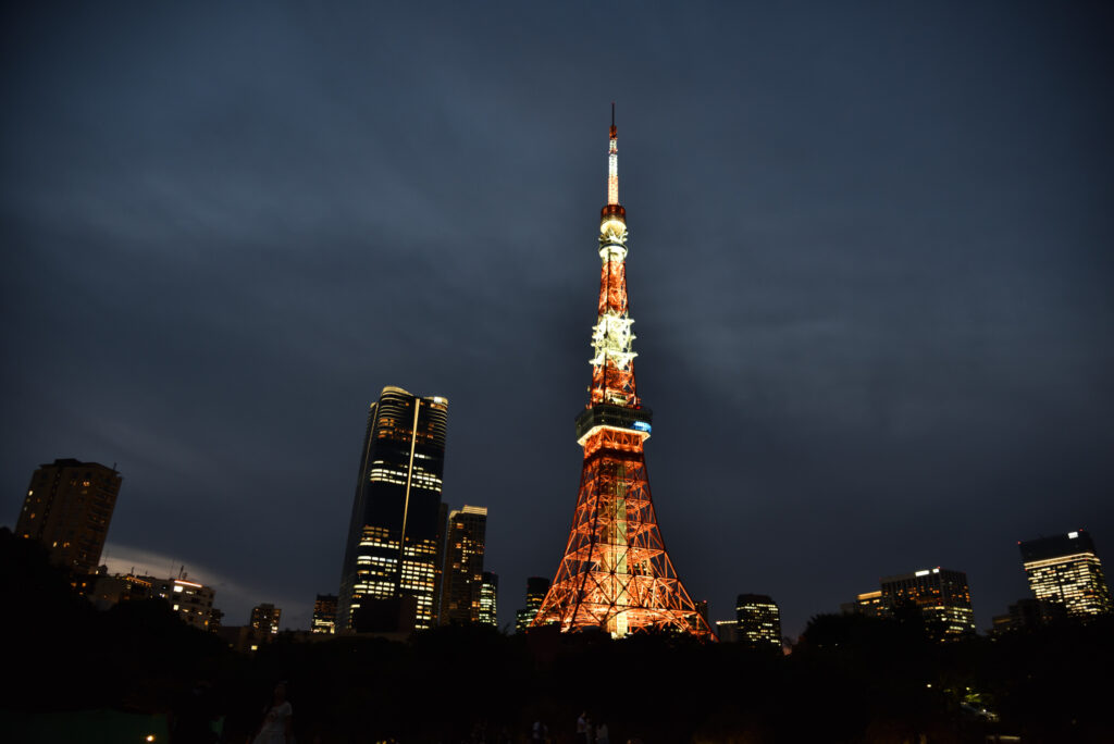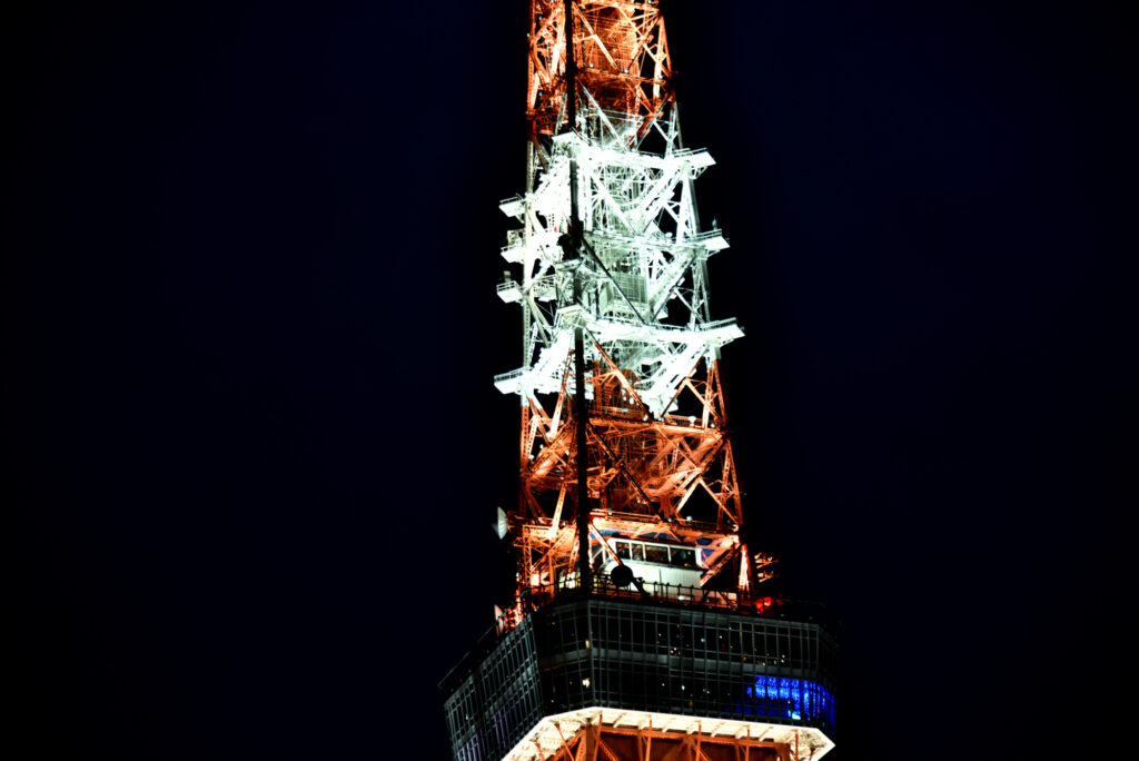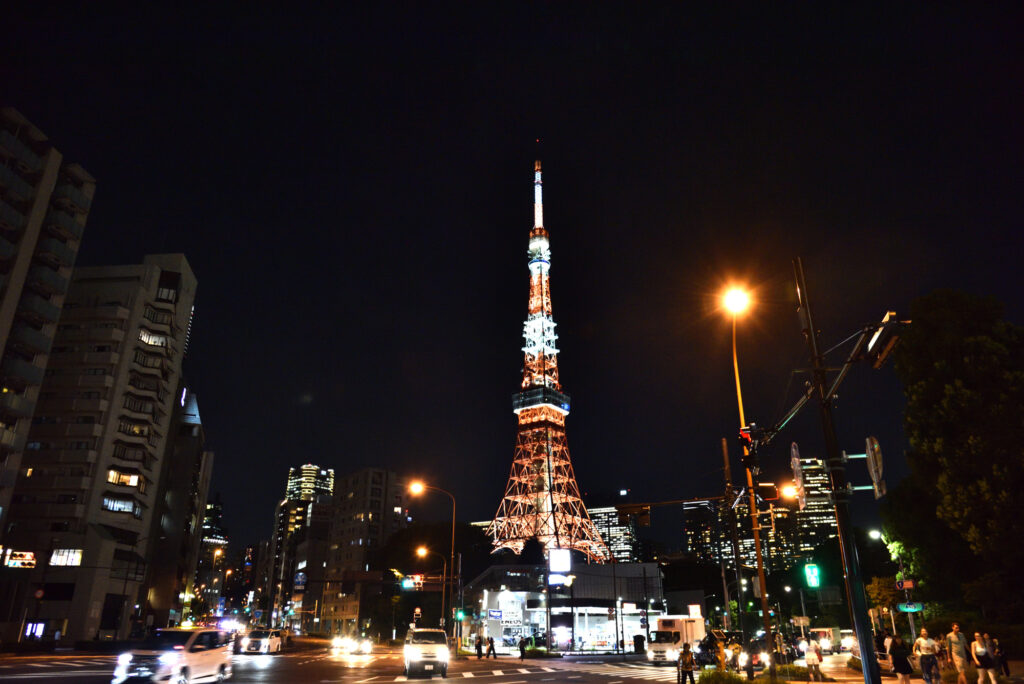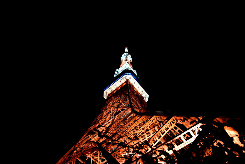 東京タワーに向かって輝くライト。180個のライトが東京タワーを浮かび上がらせる定番ライトアップ。冬は暖かみのあるオレンジ、夏は涼しげな白を基調として輝き、毎正時は、トップデッキ上部の「ダイヤモンド・ティアラ」とメインデッキ上部の「ダイヤモンド・チョーカー」が、ピュアホワイトの光で煌めきます 久びりに通常の東京タワーライトアップに 何時もの場所からタワーを一周帰宅しました