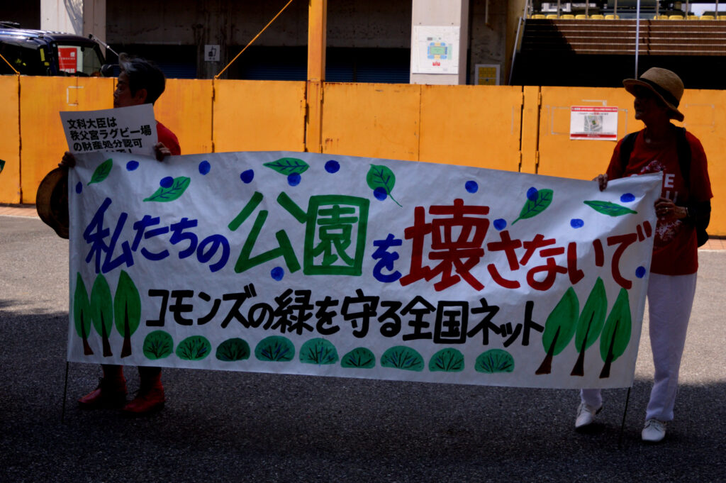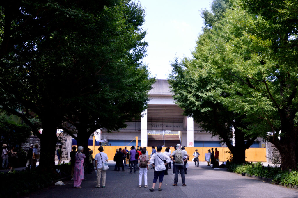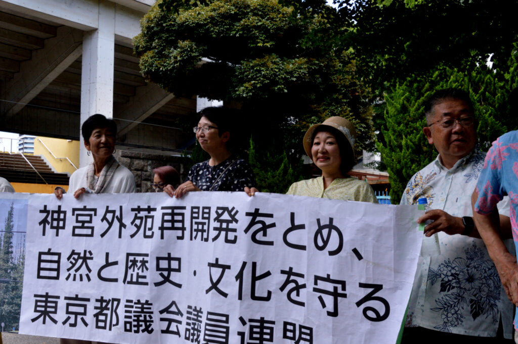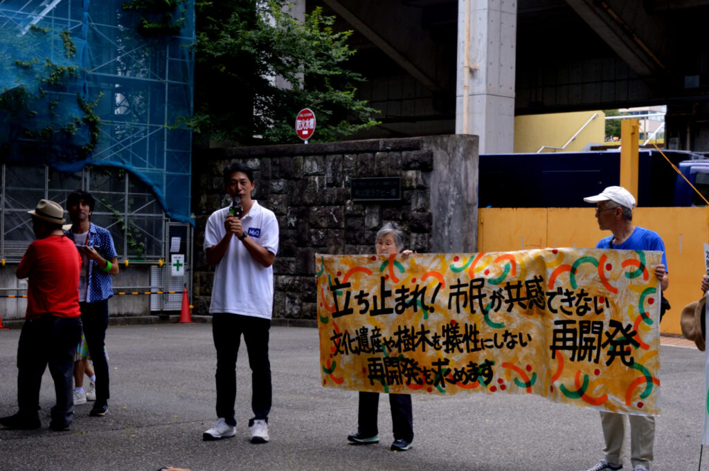 7/26 神宮外苑再開発 反対集会が秩父宮ラクビー場入口であり参加しました 神宮第二球場はもう解体され今は隣接してる3角地帯の伐採が始まってる