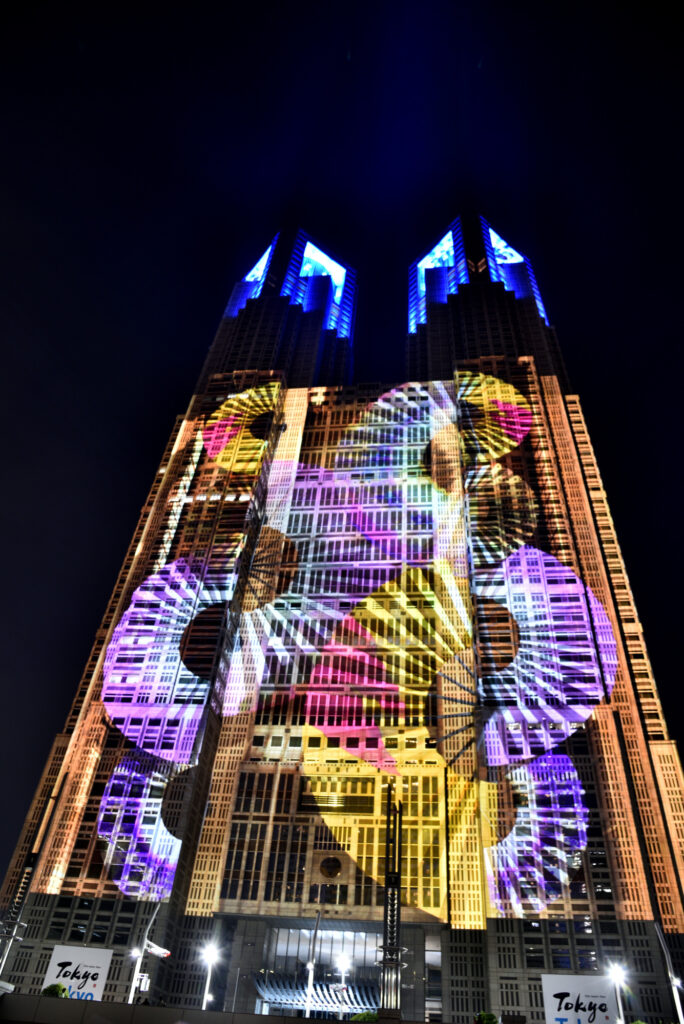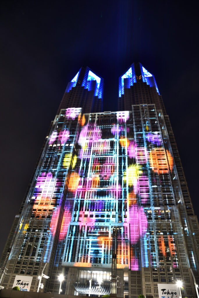 8月3日 3日連続で神宮球場花火の打ち上げを見た後 都庁プロジェクションマッピングを見に行ってみた 観光客が多く 思い思いに座ってみてる 休日と平日では演目が違う 今日は休日 19:30分から21:30分まで5回 一回毎内容が違う最初は20:00上映