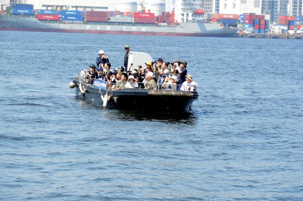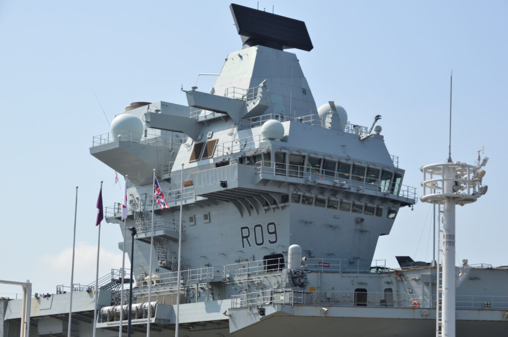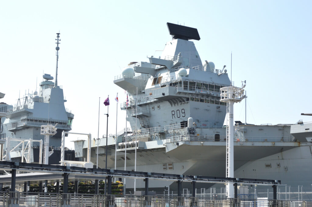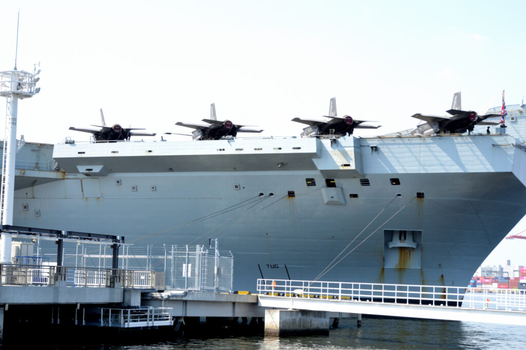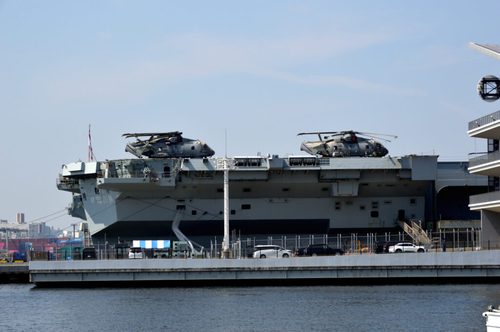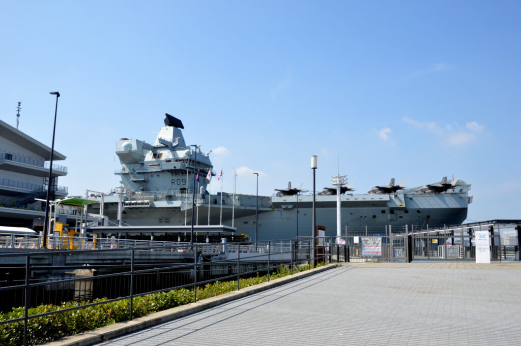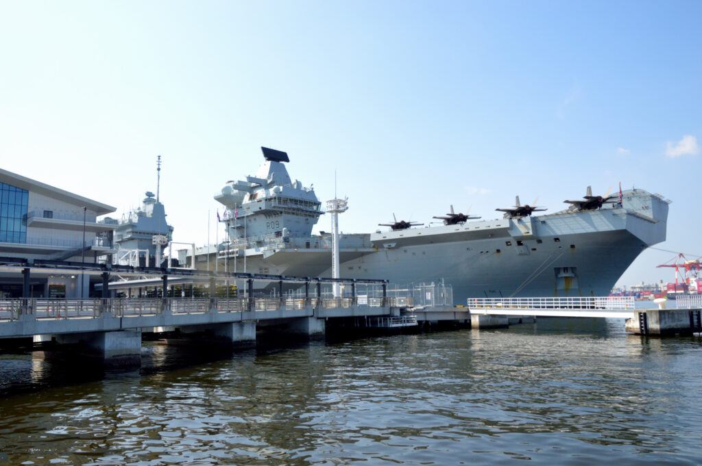 東京国際クルーズターミナルに係留してる イギリス海軍空母 プリンス オブ ウエールズを発見 9:35到着 それでもニュースを見た人が結構来てる