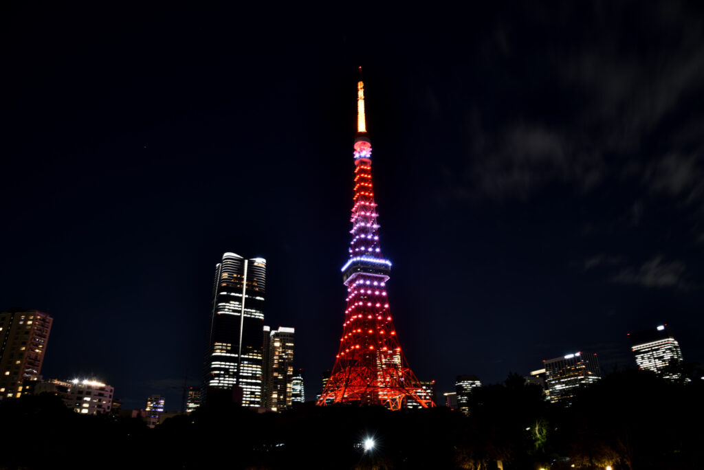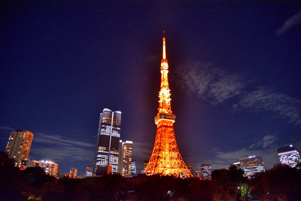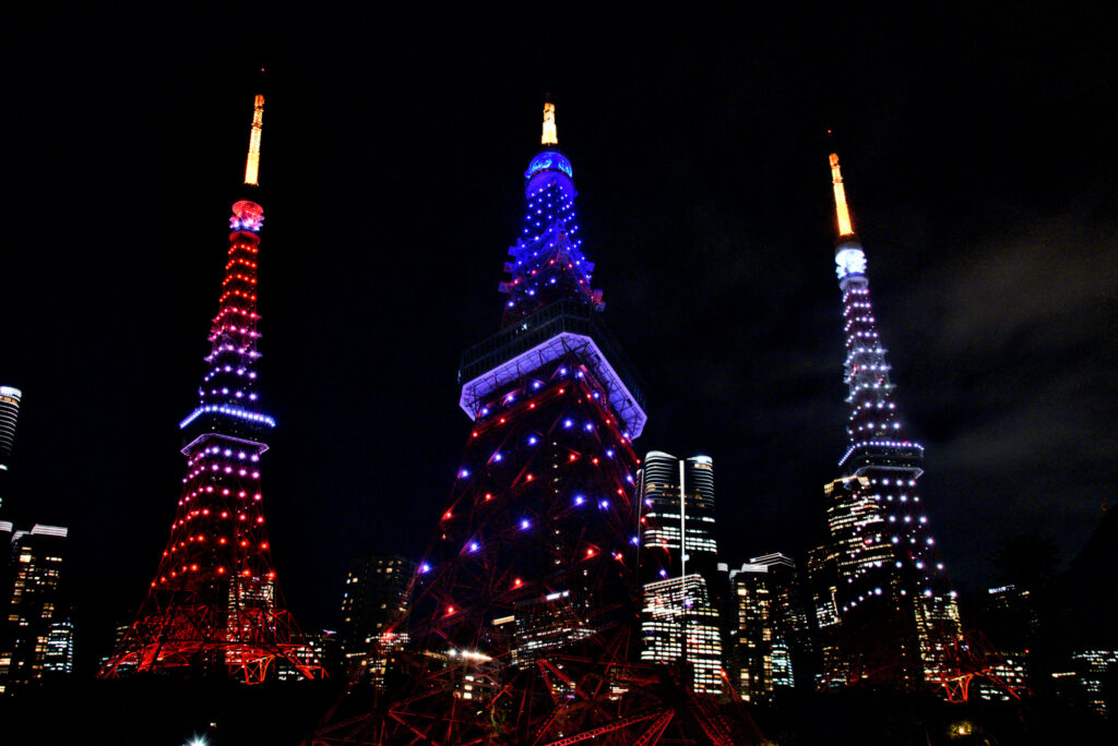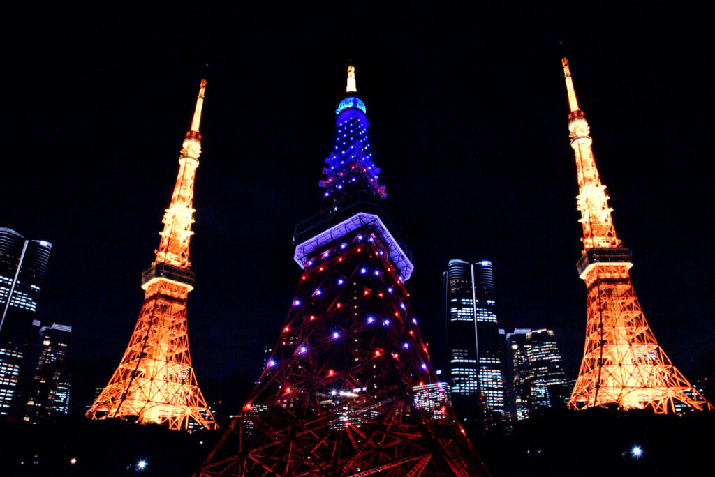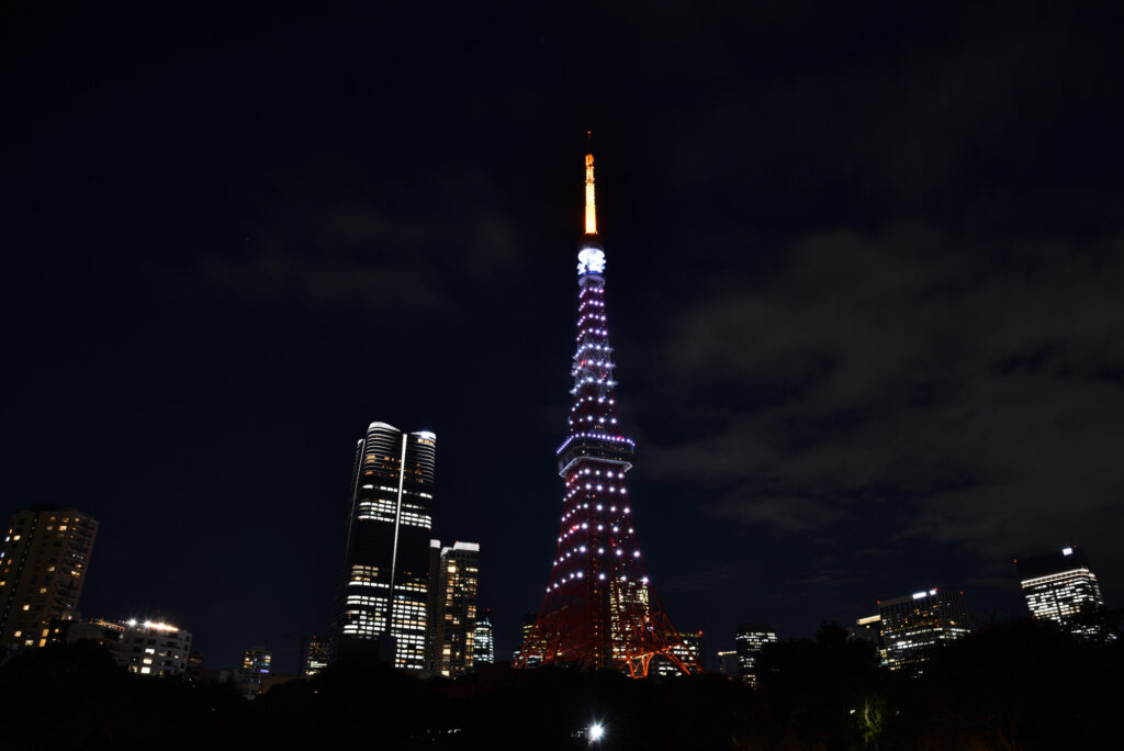 東京タワーに向かって輝くライト。180個のライトが東京タワーを浮かび上がらせる定番ライトアップ。