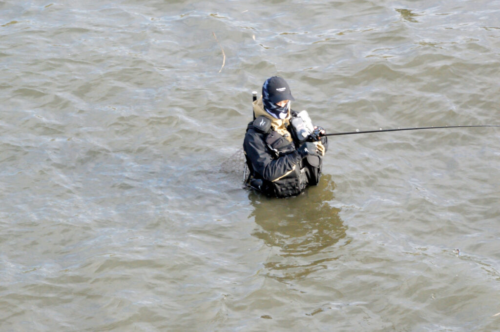 岩淵水門を目指したが途中堀切橋を渡り浅草方面に向かう 堀切橋下で釣り人が 上から見ると大きな魚が泳いでる