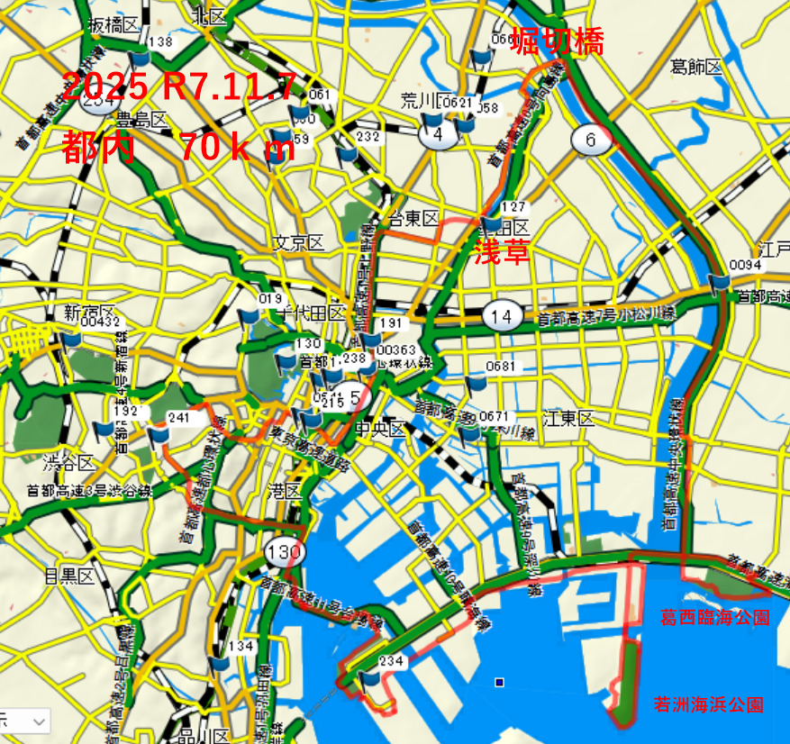 自宅から六本木 浜松町からレインボ-ブリッジ 自転車を押して渡 お台場に 若洲海浜公園 葛西臨海公園経由荒川を北上 岩淵水門を目指したが途中堀切橋をわたり浅草 上野経由で帰宅