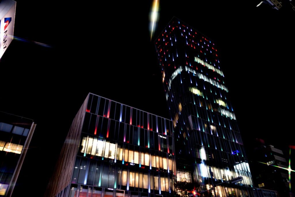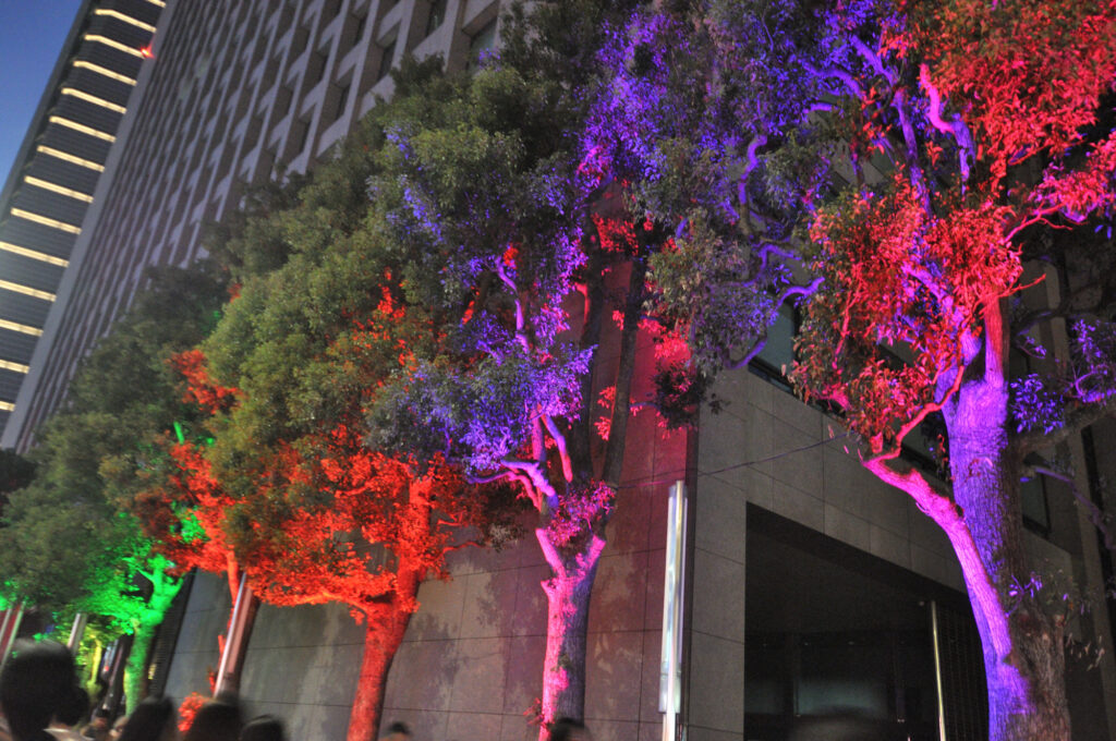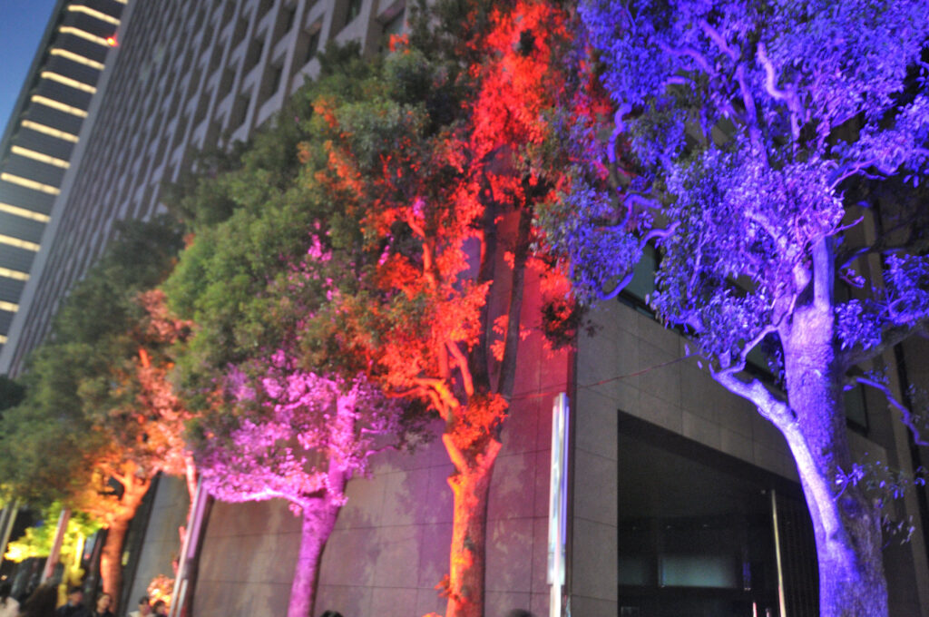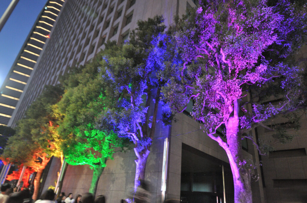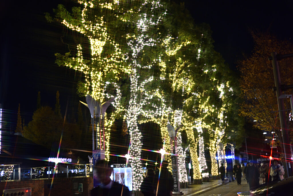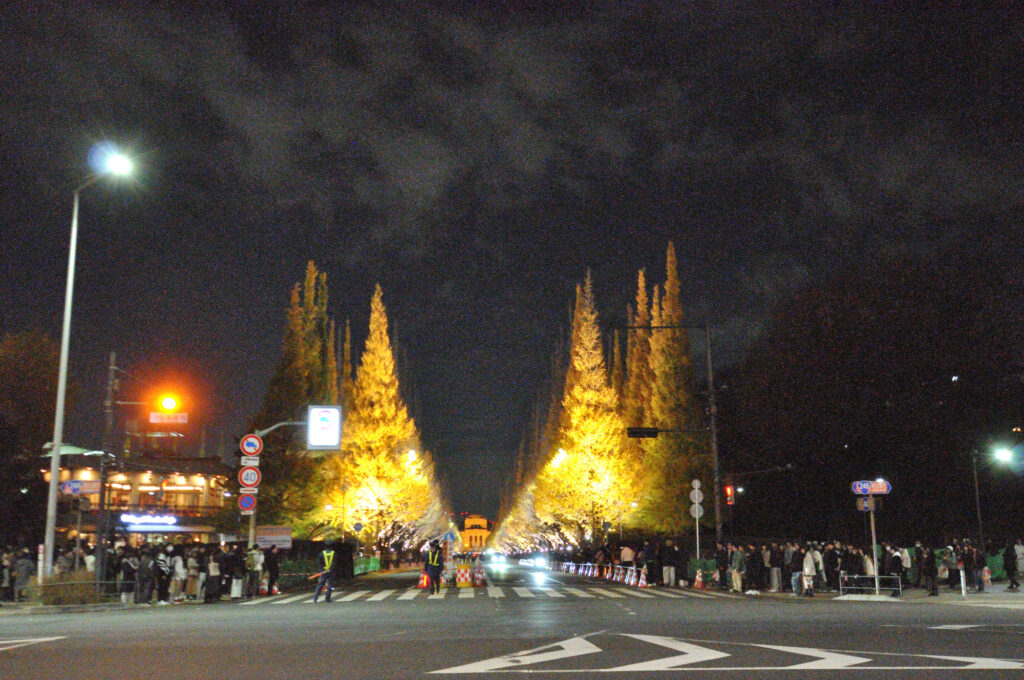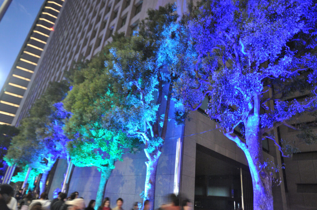 国道246 青山通りを渋谷方面に向かうと神宮外苑 銀杏並木 隣接するitochu 青山4丁目 パソナ 表参道 骨董通り 地域 企業それぞれがライトアップ
