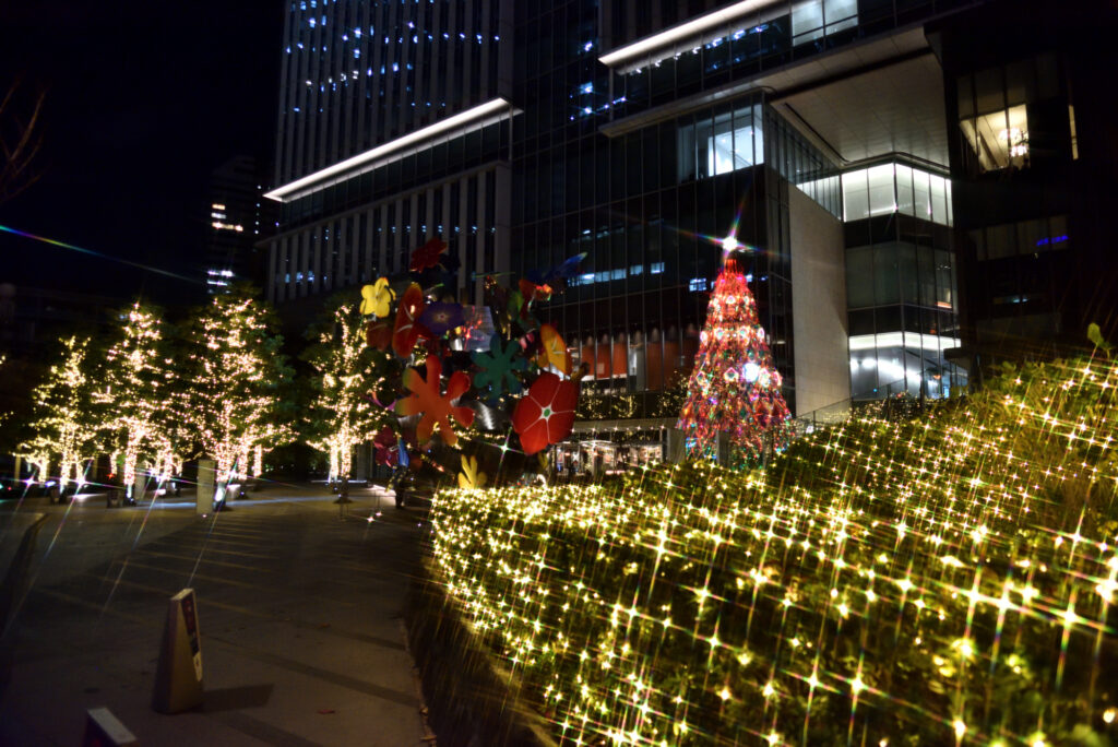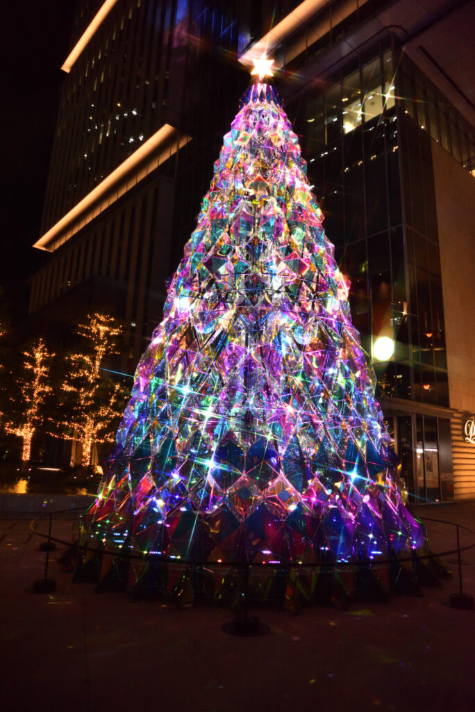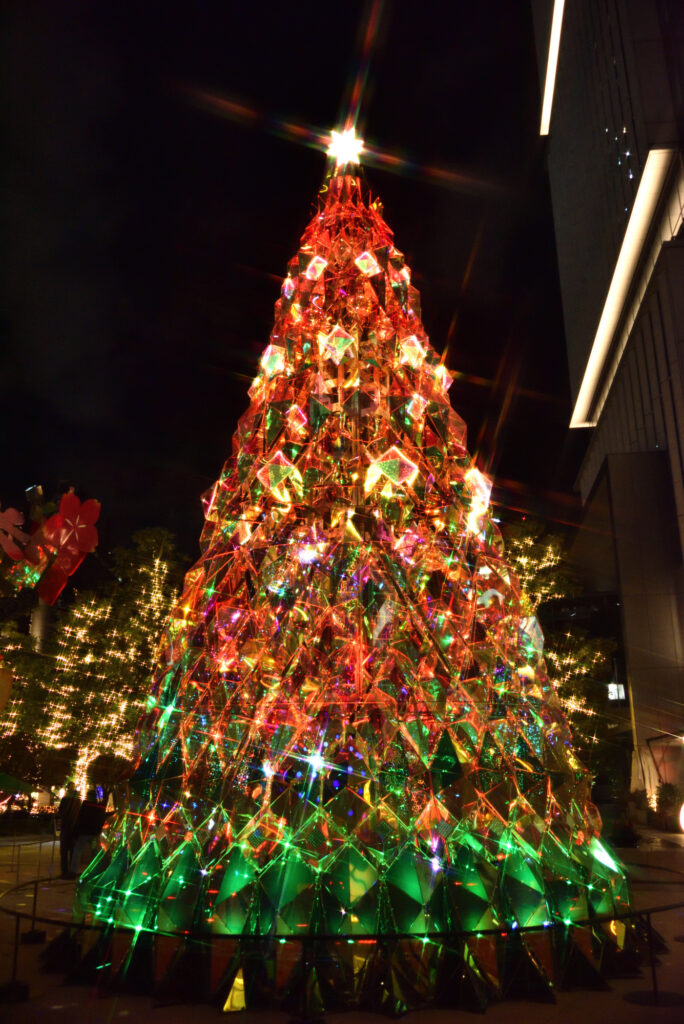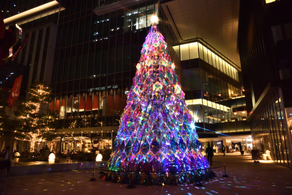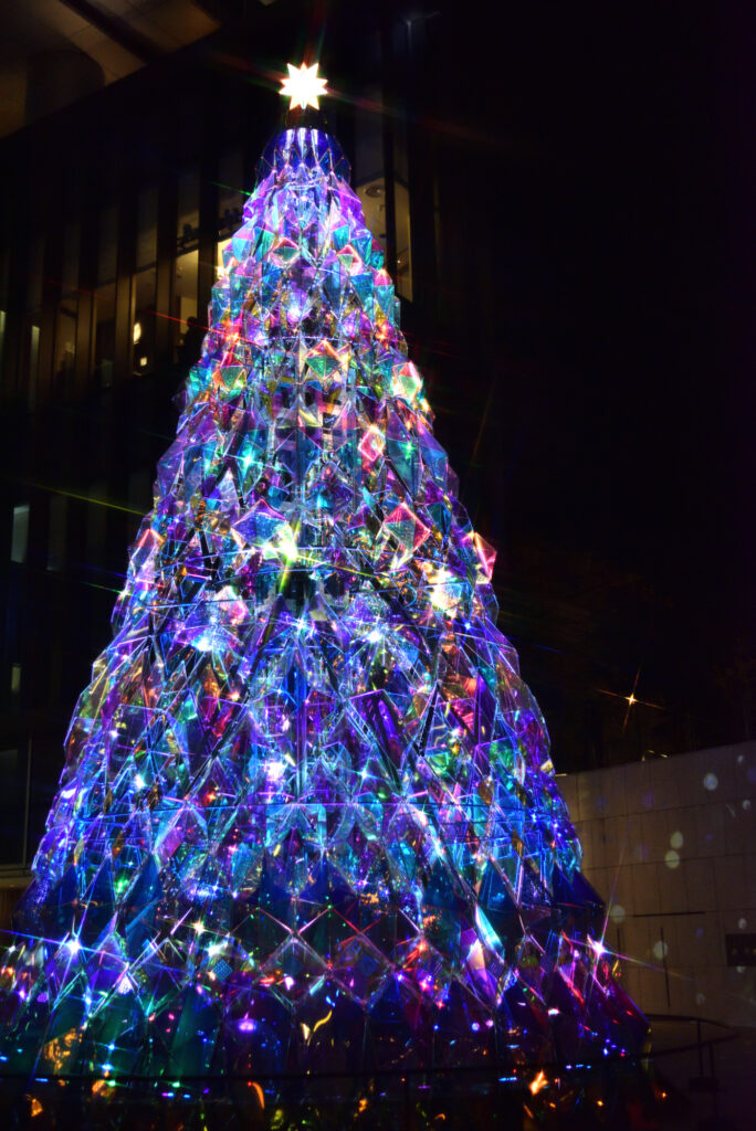 旧赤坂プリンス入口 弁慶橋を渡るとすぐの入り口広場 1F「花の広場」にあるクリスマスツリーは、光と影の表現を追求するアート集団「MIRRORBOWLER」が手掛けた光が織りなす幻想的な演出が魅力。ツリー全体を光の楽器で見立てたインスタレーション