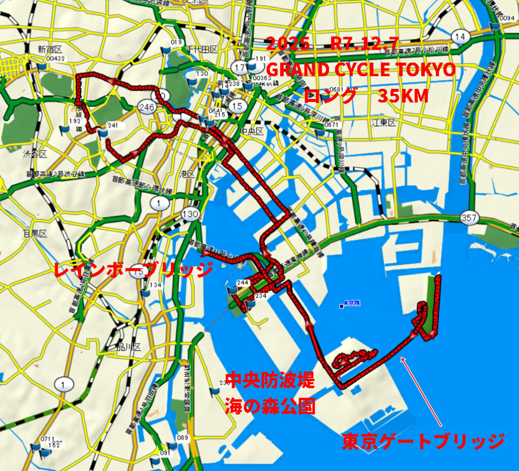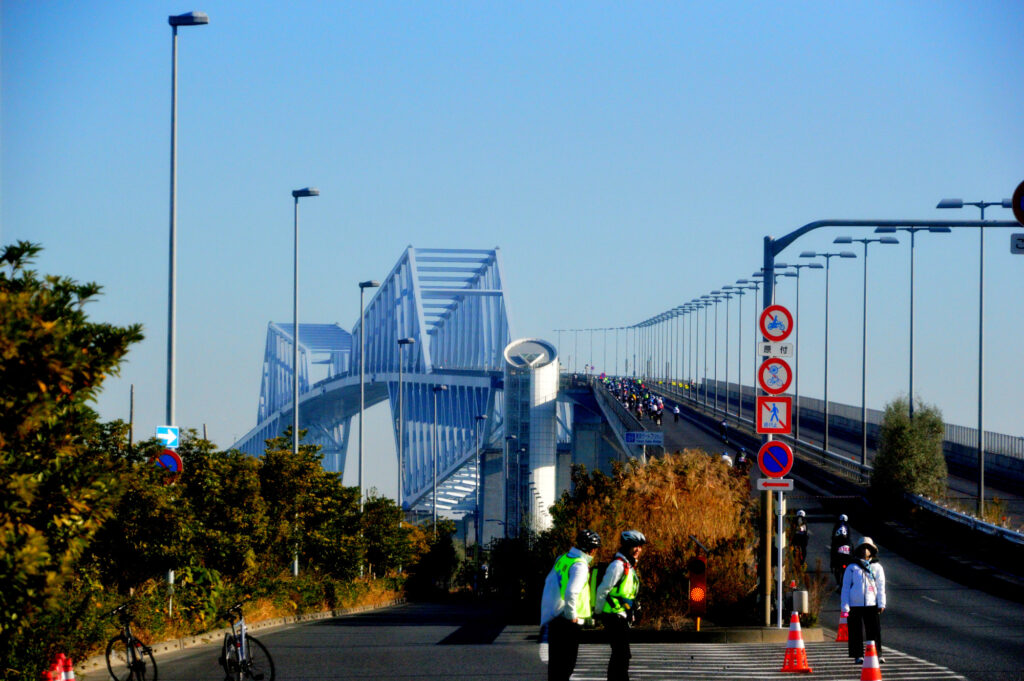 海底トンネルを抜け 都のゴミ捨て場 今は海の森公園に向かう ここにエイドステーションがアリ休憩 水分補給 出発後 東京ゲートブリッジに向かう 止まると各所にいるスタッフが近寄り止まらないように注意されるのでなかなか写真が撮れない