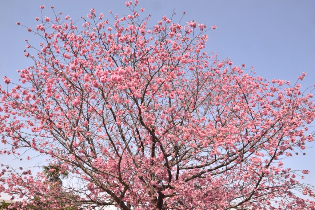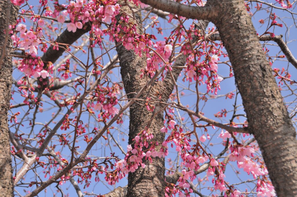 ピンクの花びら 青空の下で開花状況を見に行ってました